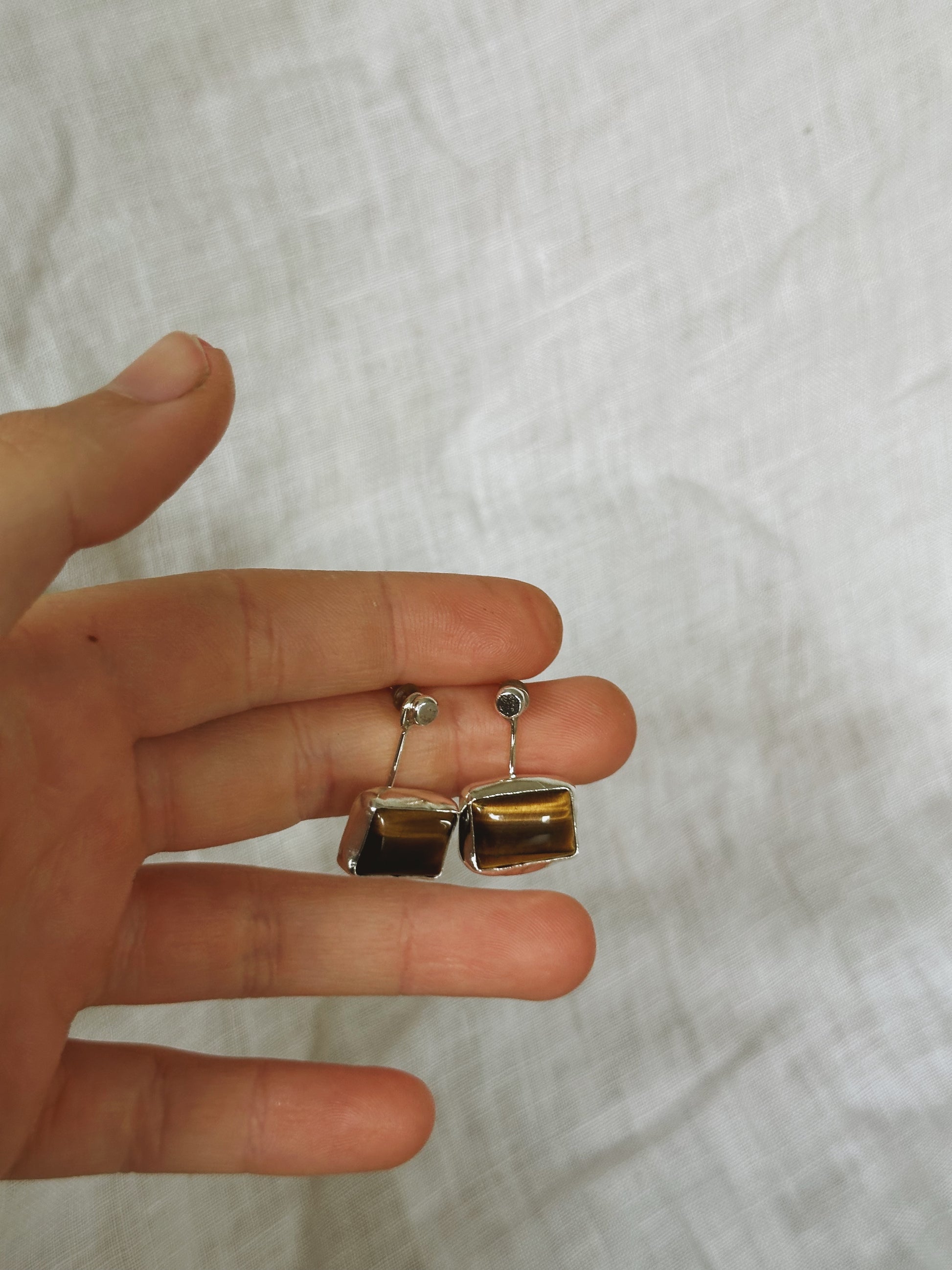 A gorgeous, creative design, these hand crafted studs are a must for your adornment collection. Set in this pair are golden and brown tigers eye stones, glistening whenever they catch the light. Handcrafted from 925 sterling silver.