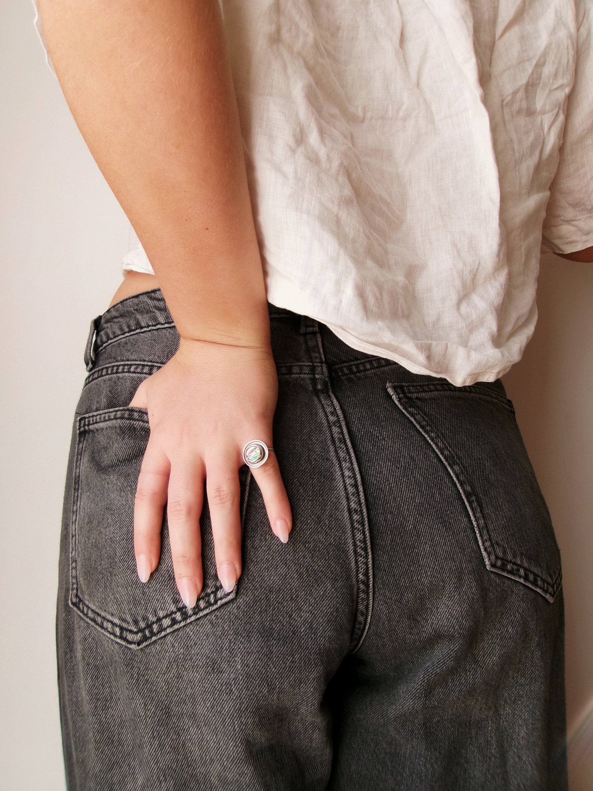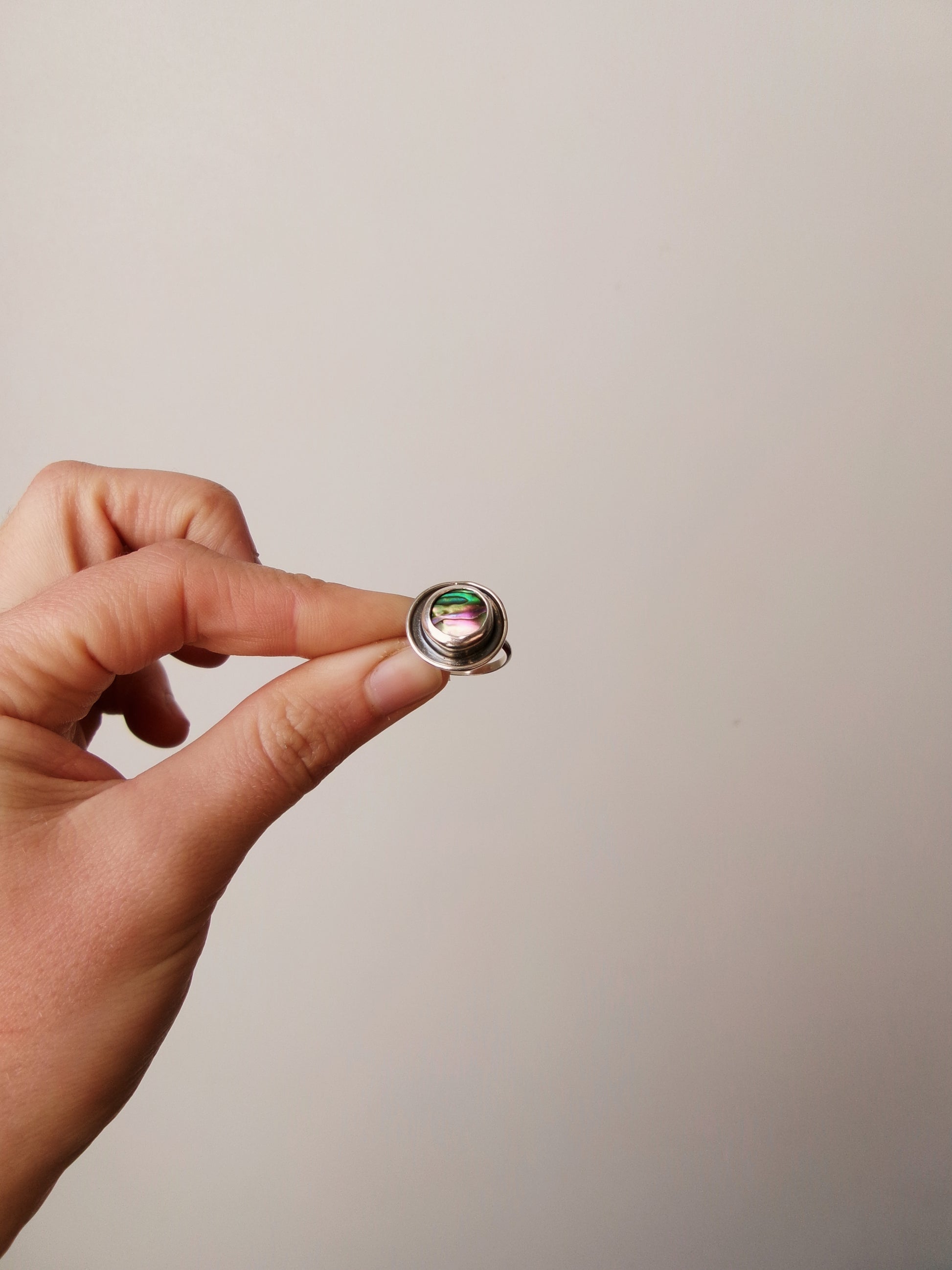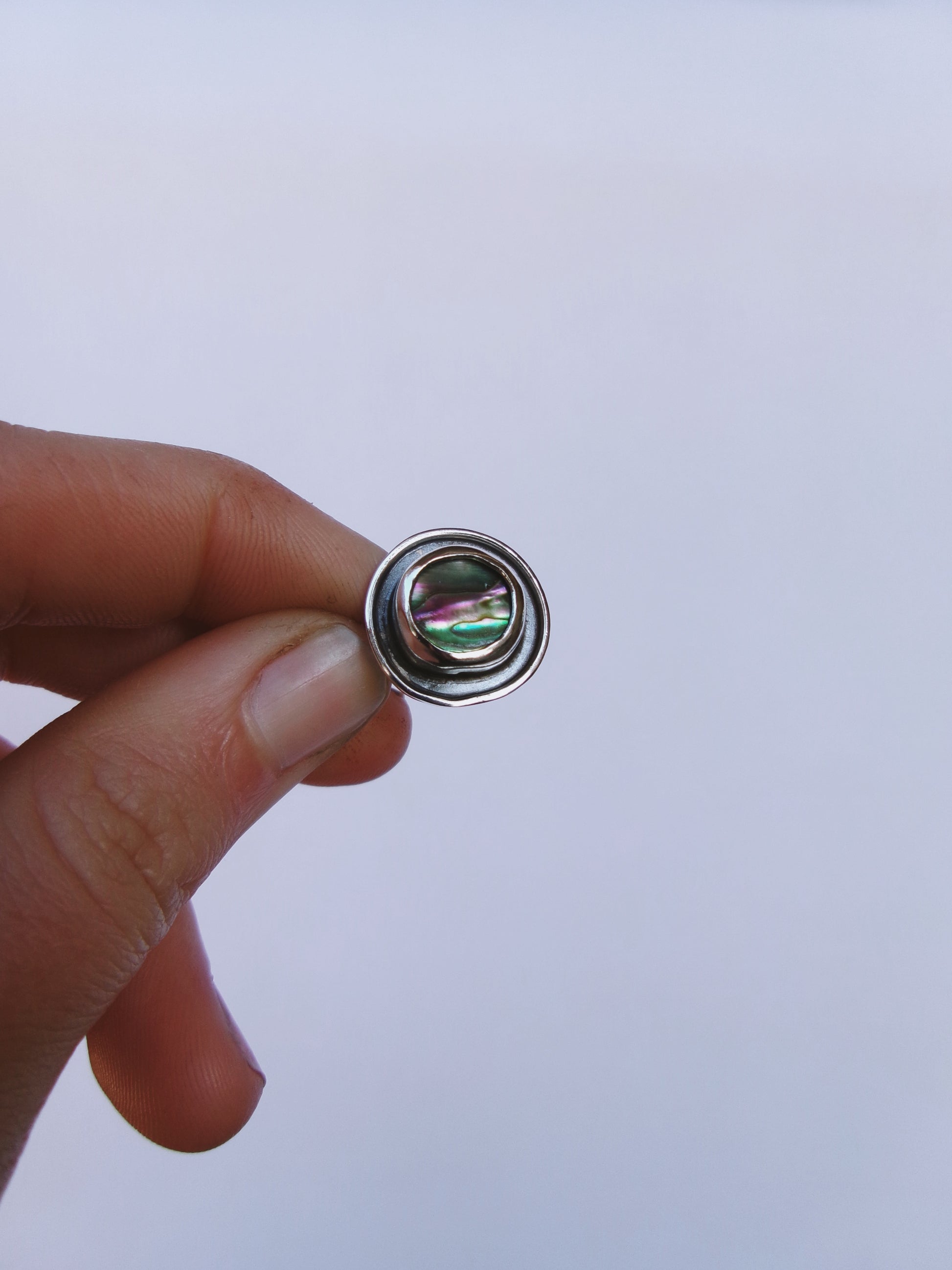 Hand created from 925 sterling silver the Cordelia Ring is an mesmerising adornment creation. Set at its center is a luminous shard of abalone shell. Patina is added to this piece to create depth and highlight the iridescent colours of the shell Completely crafted by hand Size 6.5 (M1/2)