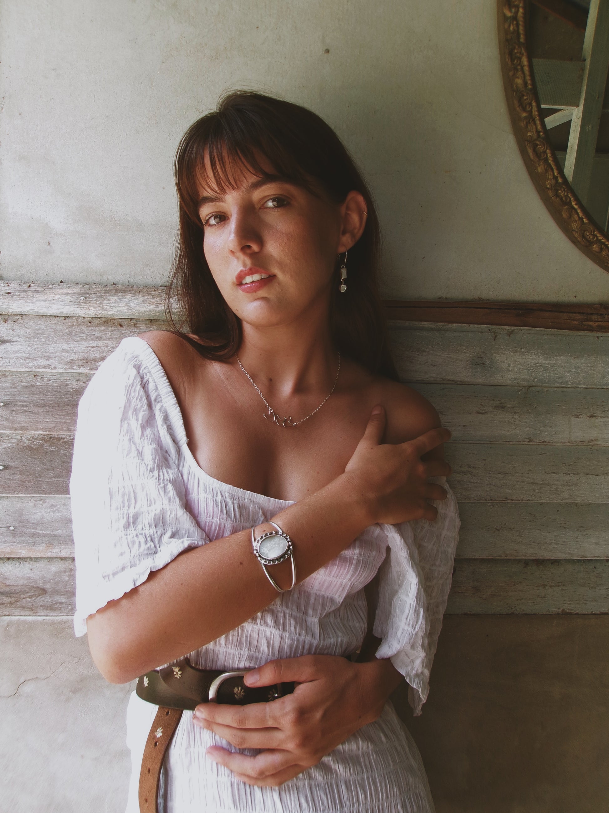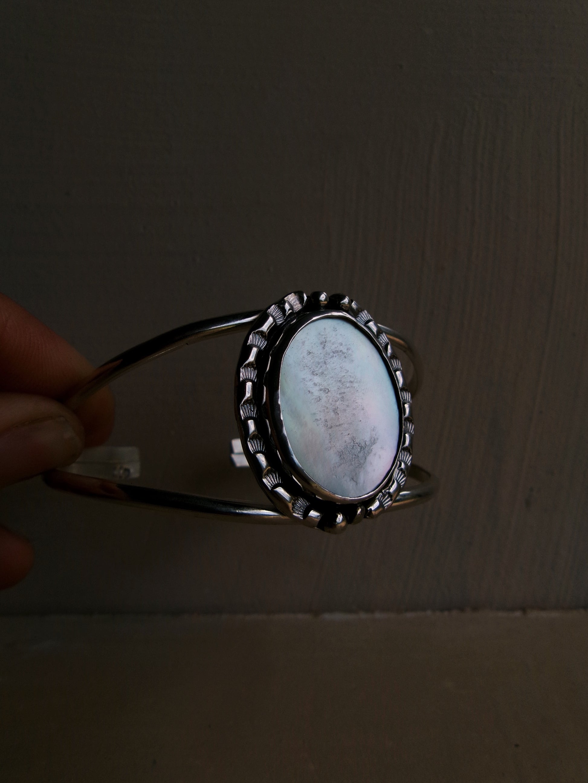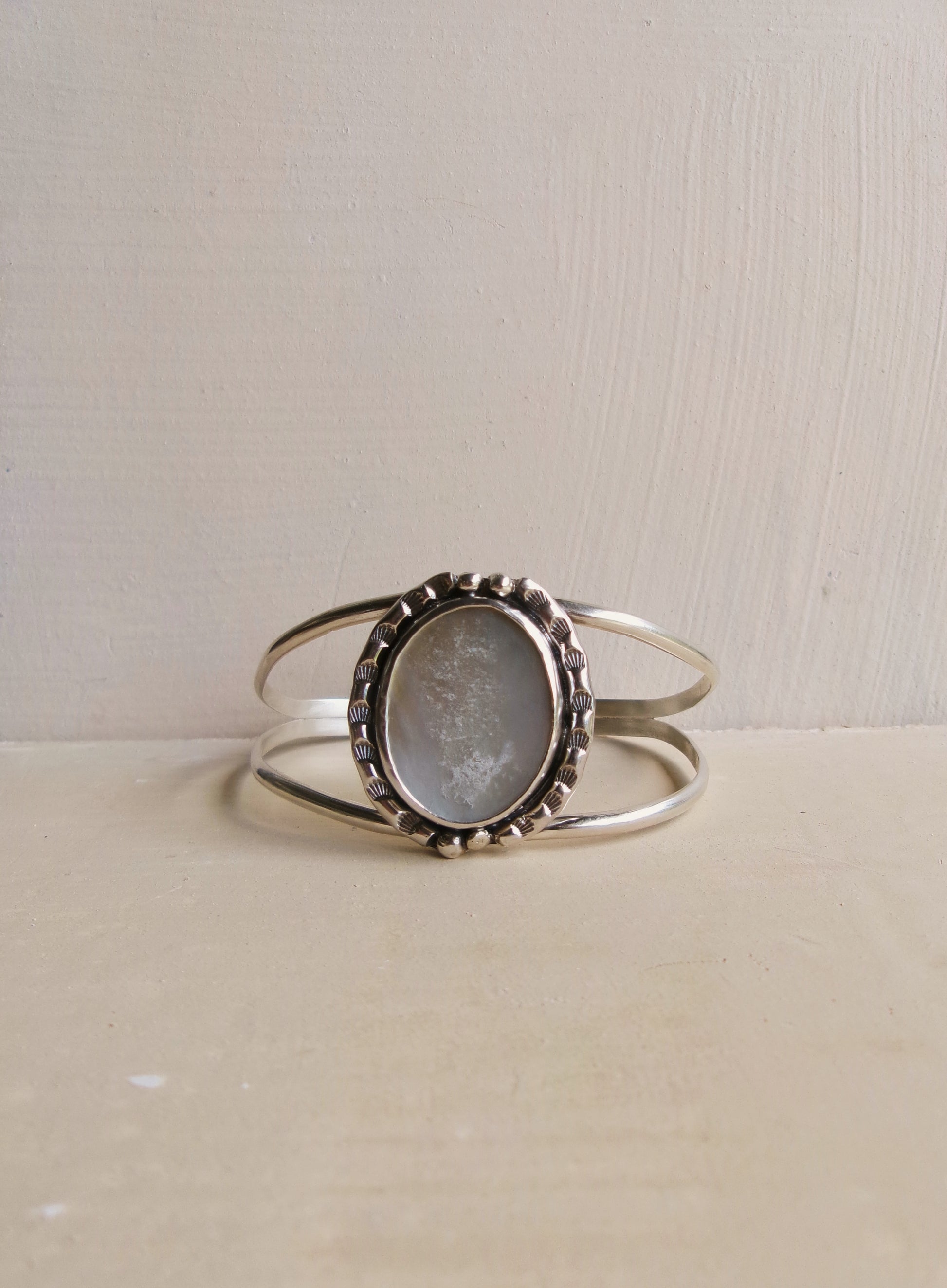 Set at its center is a gorgeous mother of pearl piece, encased forever in its silvery setting. Decorated by its hand stamped border and dotted details. Set on a 16cm completely adjustable band. Entirely handmade from 925 sterling silver.