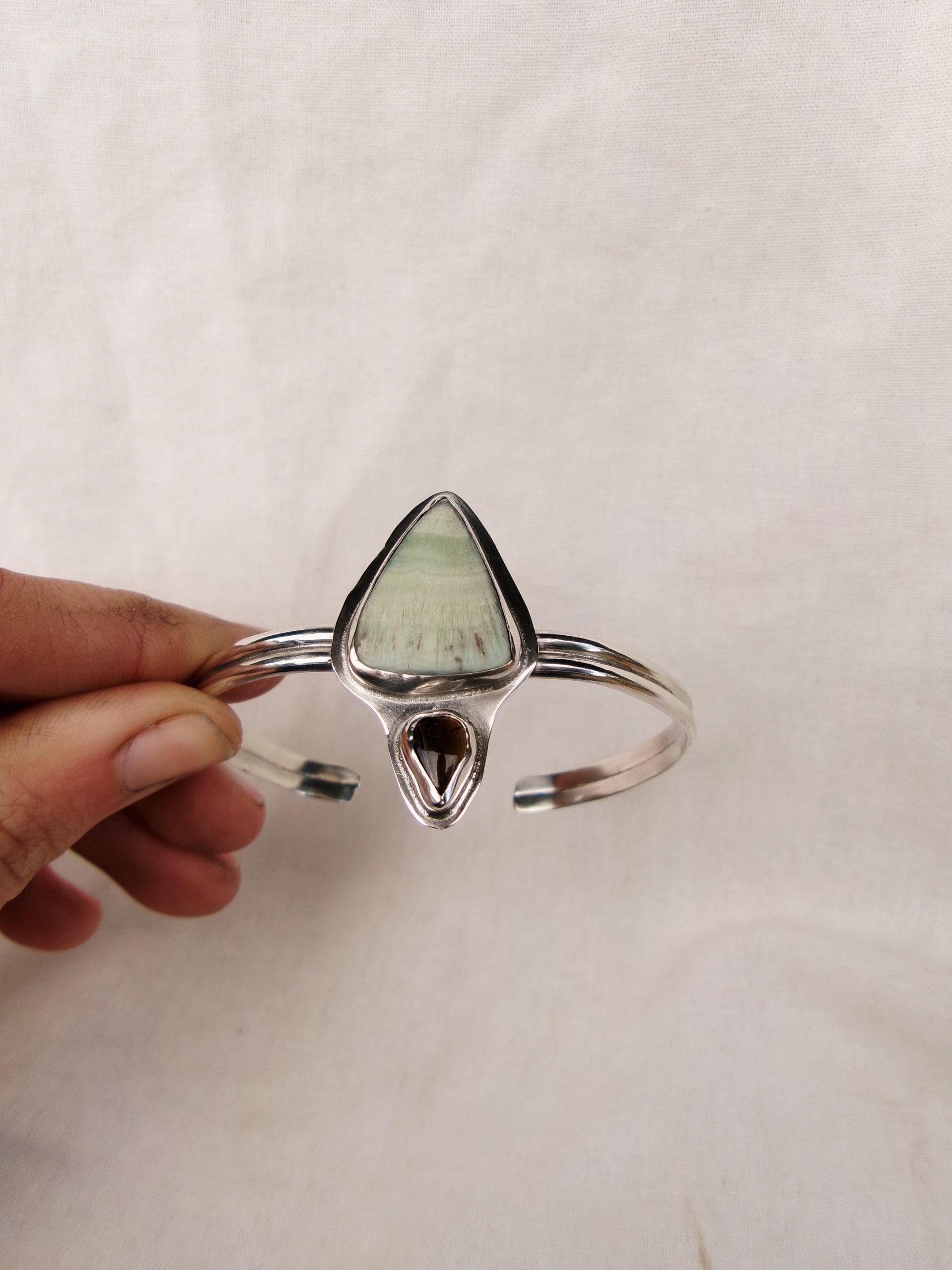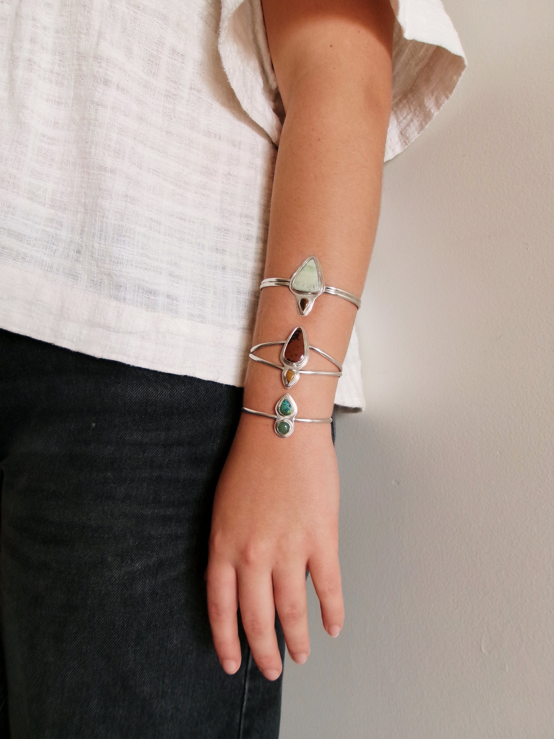 Dune Cuff ~ A gorgeous bespoke adornment piece crafted by hand from sterling silver. Set with a banded aragonite stone and below it, a tear drop tigers eye piece. Soldered to the setting a double adjustable 16cm band.