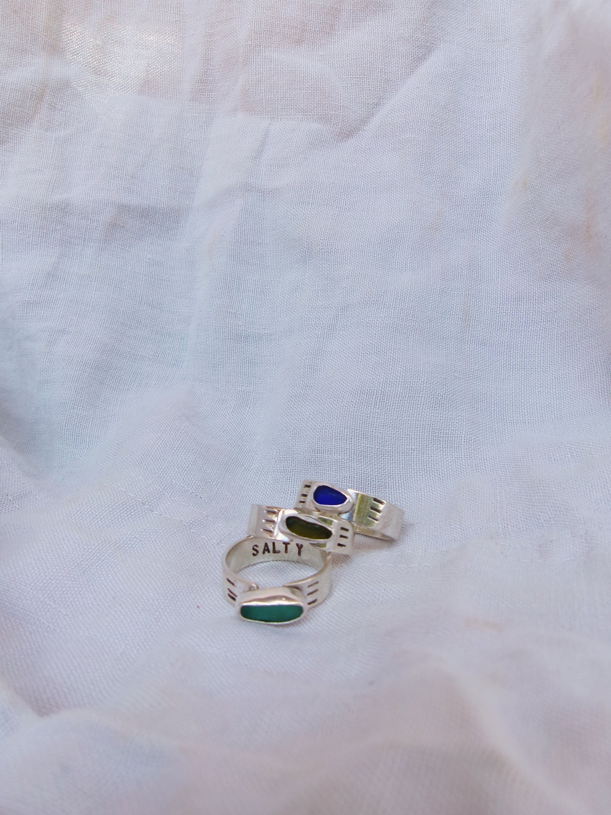 Like the tide's gentle rhythm, this ring carries the pulse of the sea. Handcrafted with smooth, naturally ocean-worn glass set in silver, it mirrors the eternal dance between stillness and motion. Where the water retreats, only to return anew. Each curve and shimmer tells a story of movement, transformation, and calm resilience. A reminder that, like the tides, we are always finding our way back to balance. Stamped with a little hidden engraving “salty.” Size 10.5 (V)