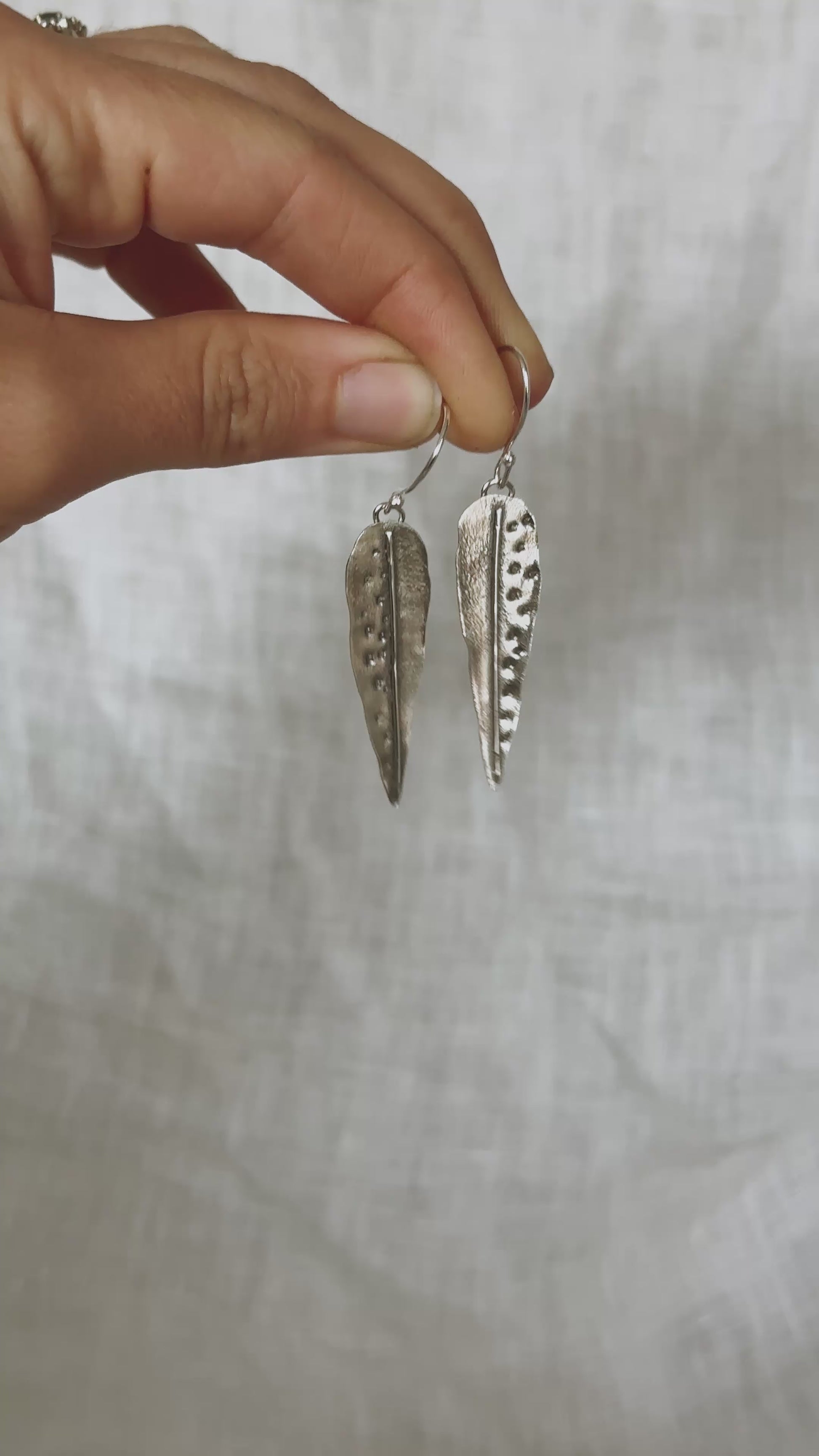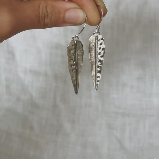These earrings are wearable art. So many intricate details to make these hand crafted gum leaves the unique breath taking pair that are. Textures carefully creating by slowly melting the surface layer of the silver. Little solderings and dotted impressions are added to bring these little silvery gum leaves to life. Handmade from 925 sterling silver .