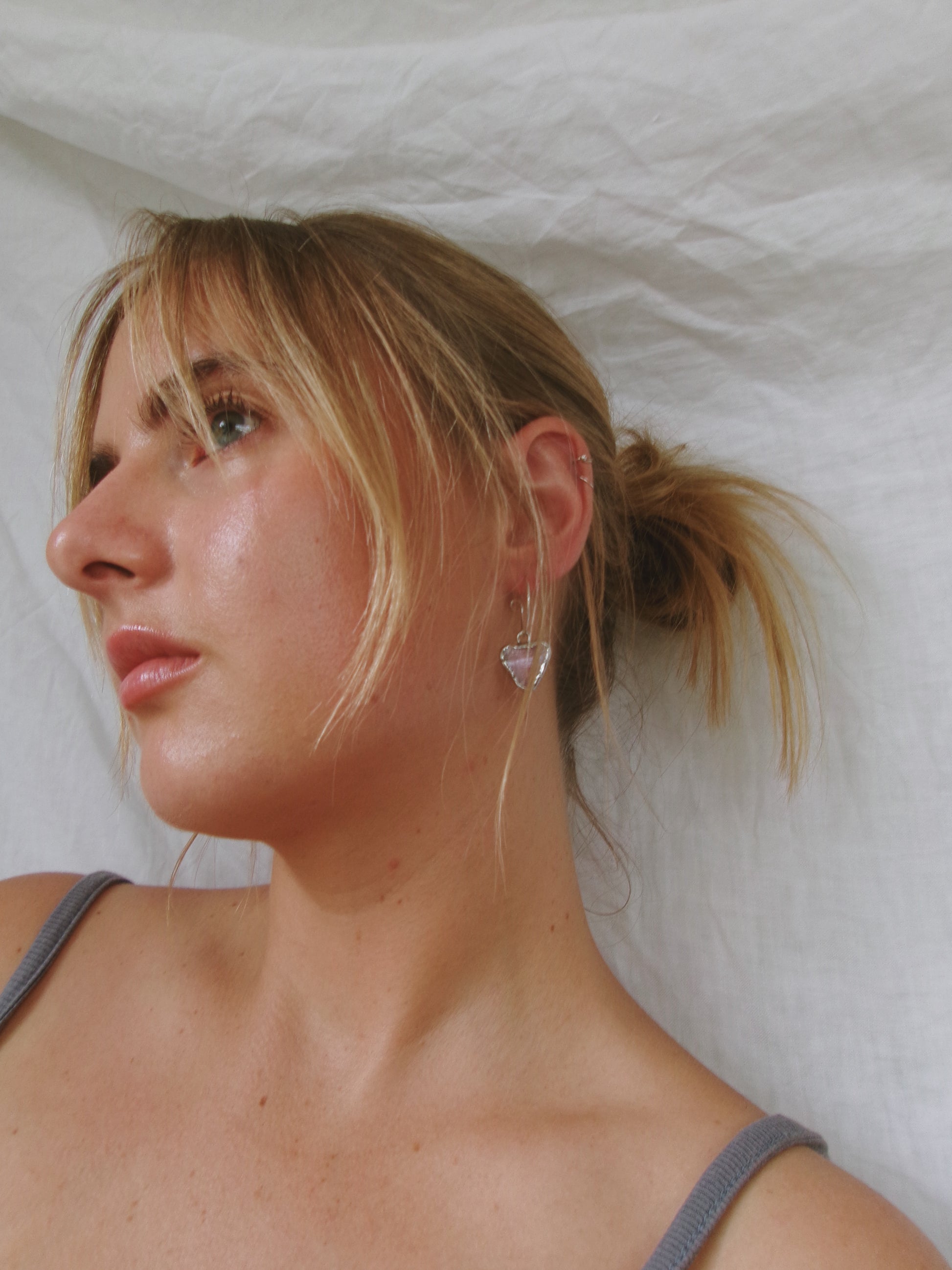 The sweetest little heart hoops created from carefully cut out and ground to shape rosey coloured stained glass panels. A piece that catches light in the most magical way.