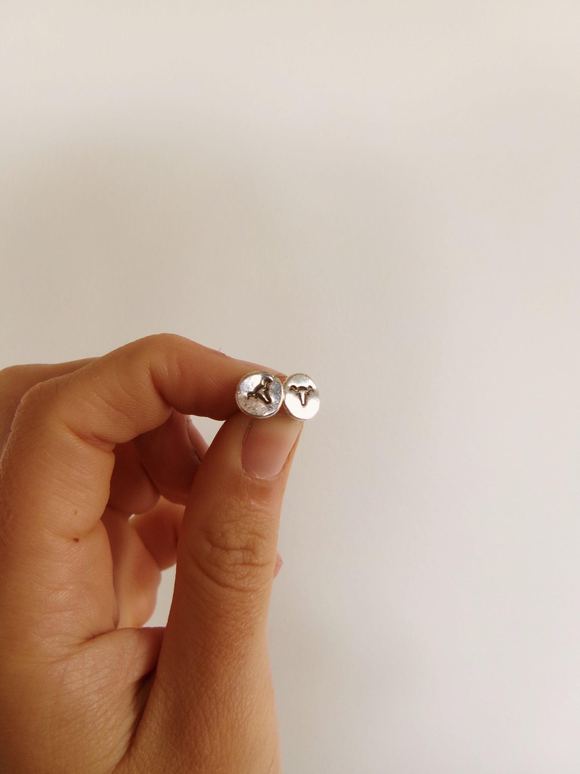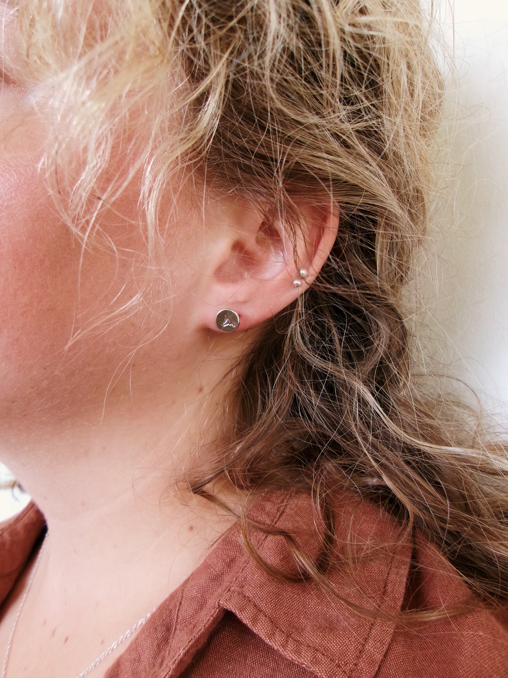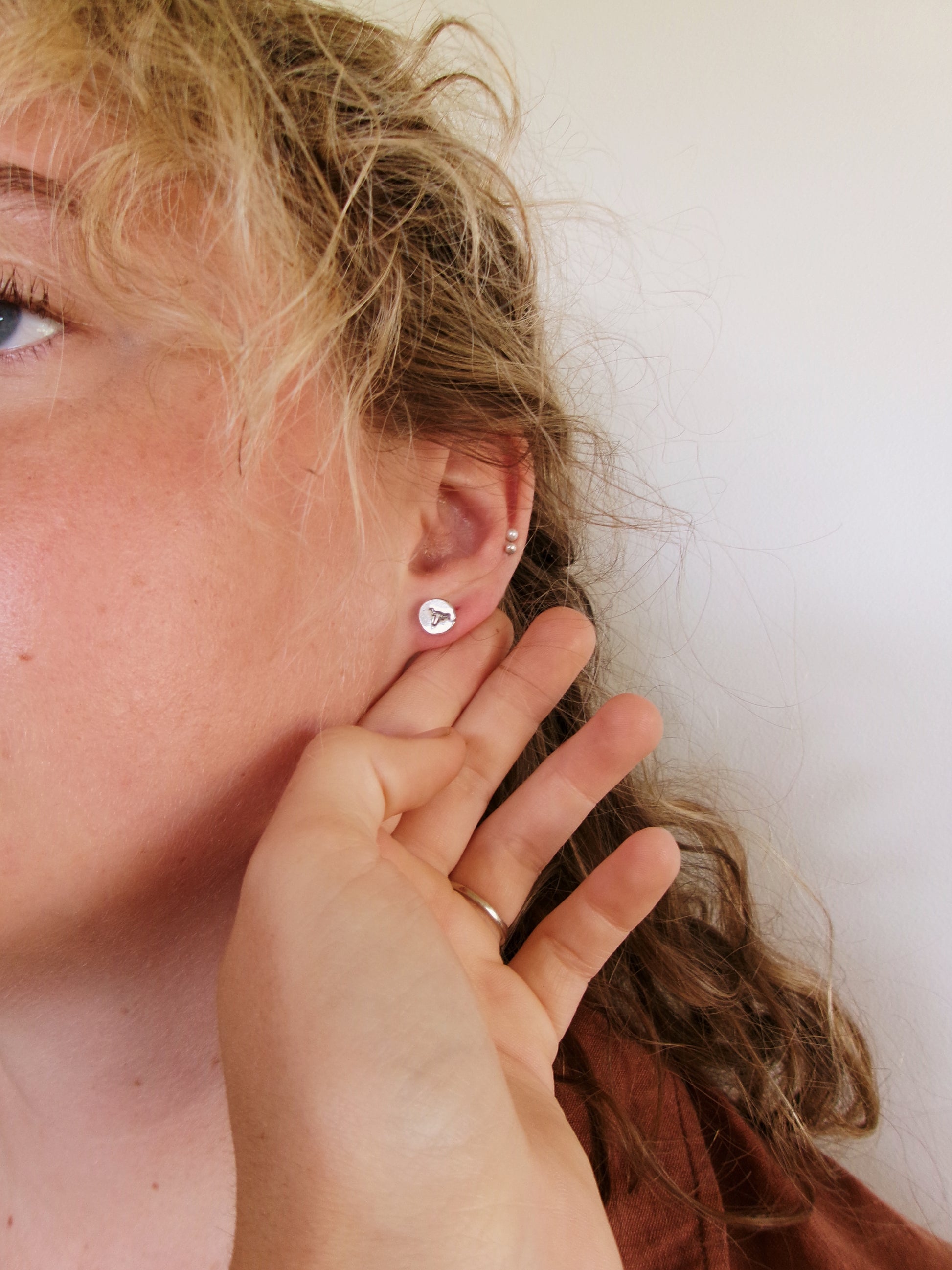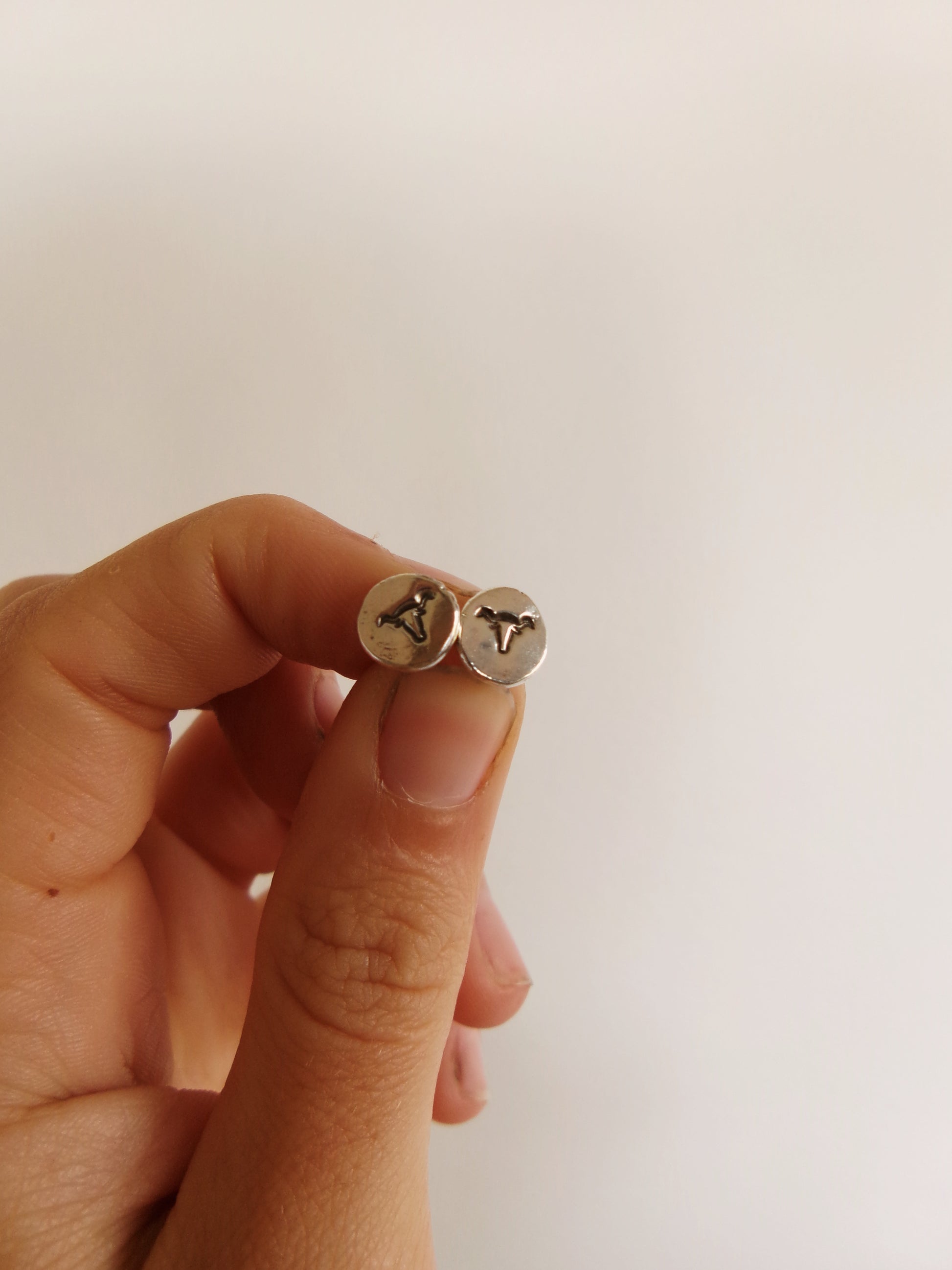 These studs are crafted from recycled melted silver, given new life. Impressed into the silver is a the silhouette of the Longhorn, an animal known for weathering harsh landscapes and thriving through adversity. A symbol of strength, resilience, and unwavering will. Each Stud is individually formed and textured by hand, giving it a soft, organic character unique to your piece.