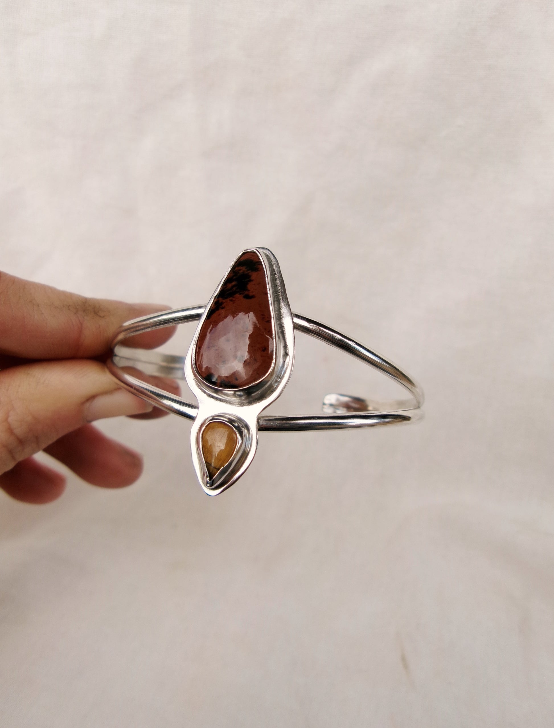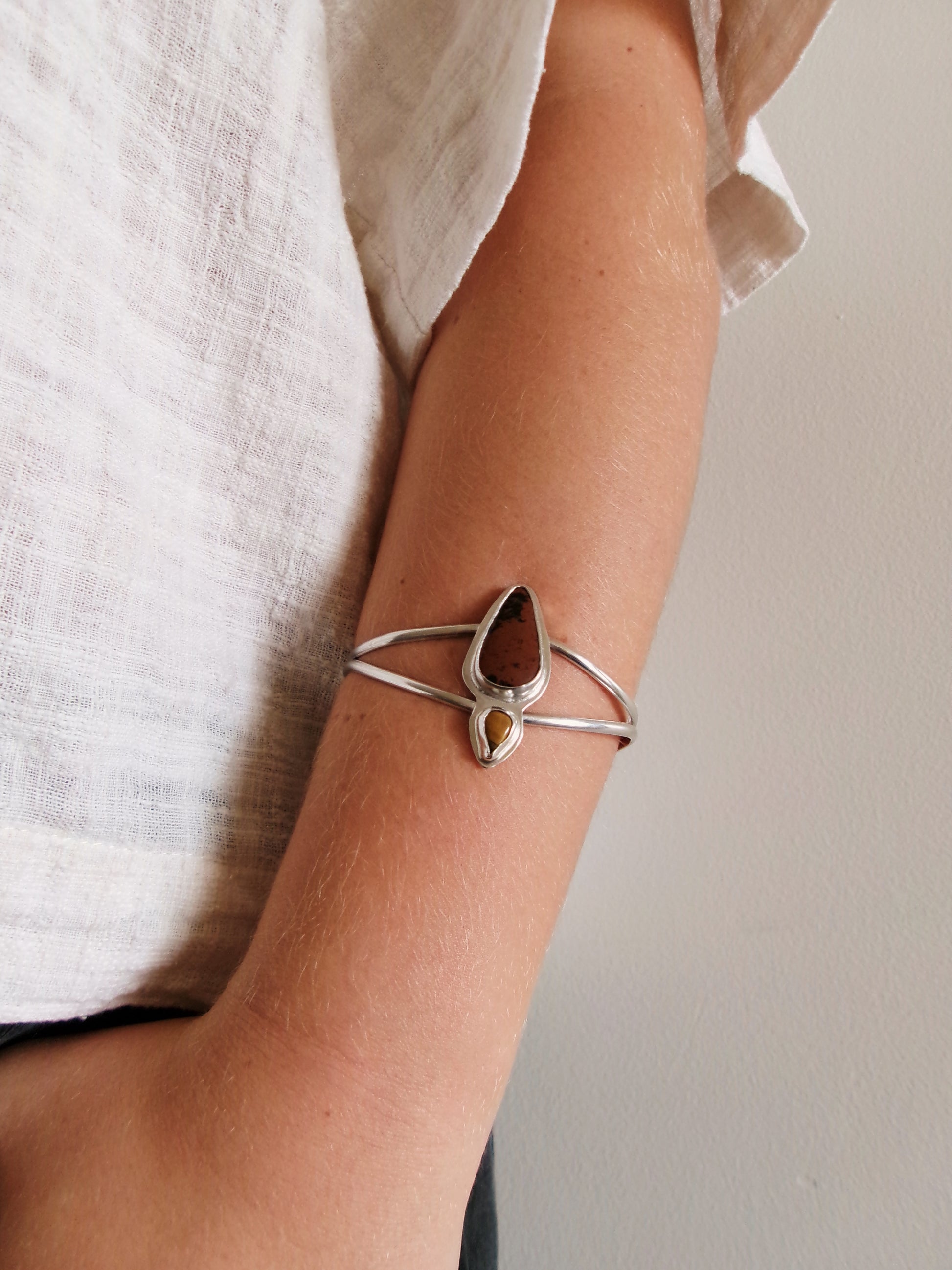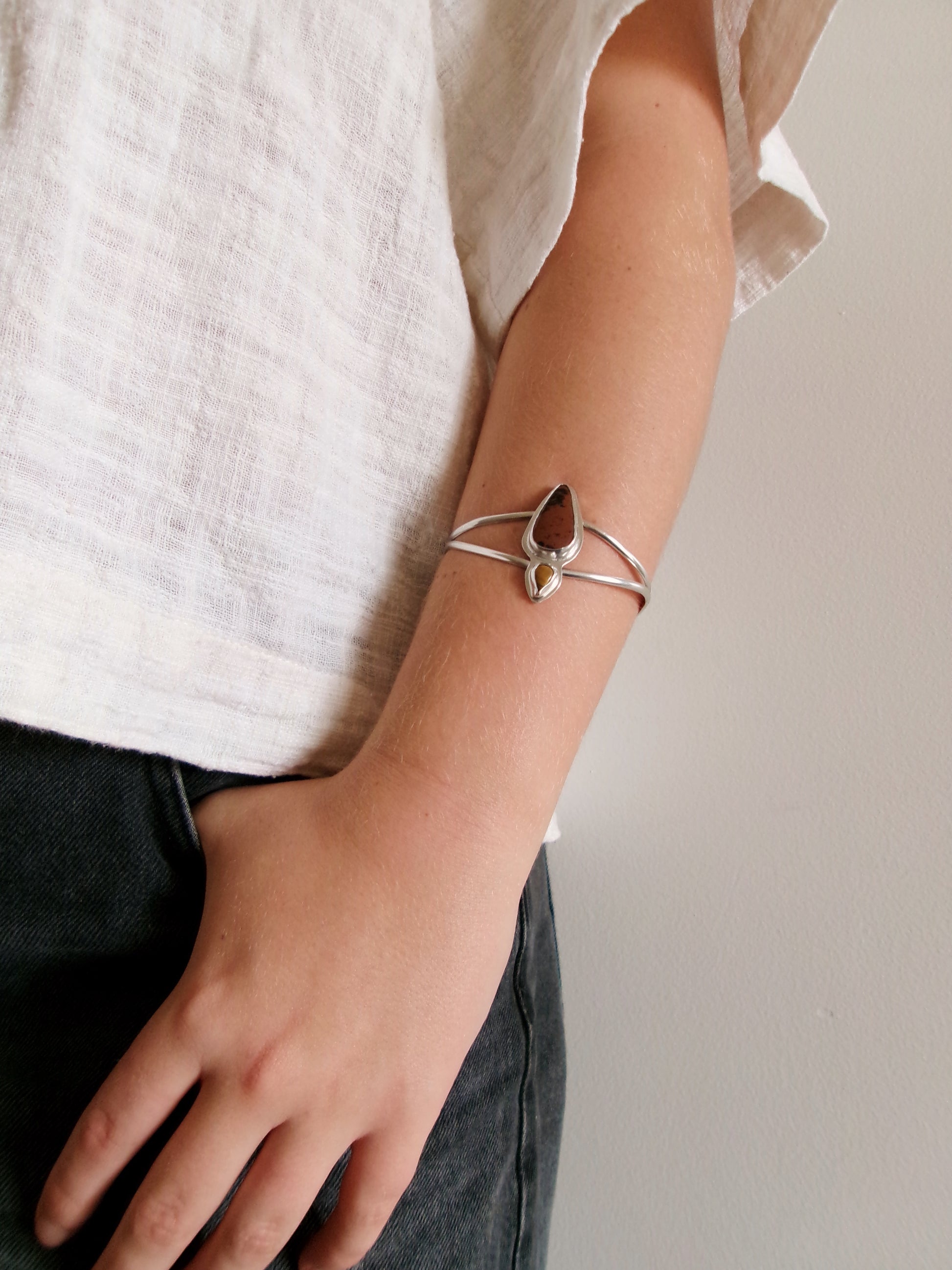 Mahogany Tears ~ A gorgeous bespoke adornment piece crafted by hand from sterling silver. Set with Mahogany Obsidian stone and below it, a tear drop tigers eye piece. Soldered to the setting a flattering double adjustable 16cm band.