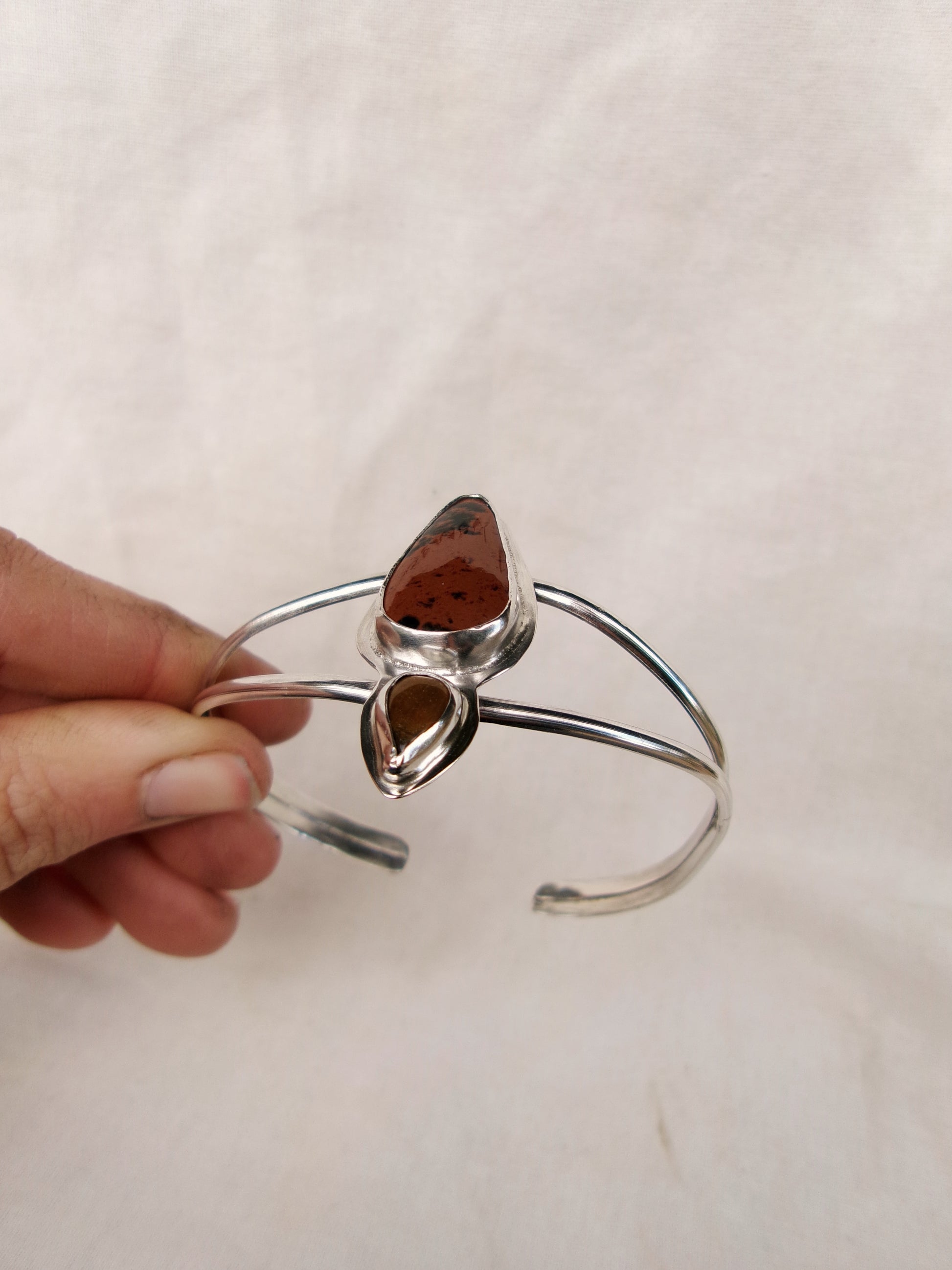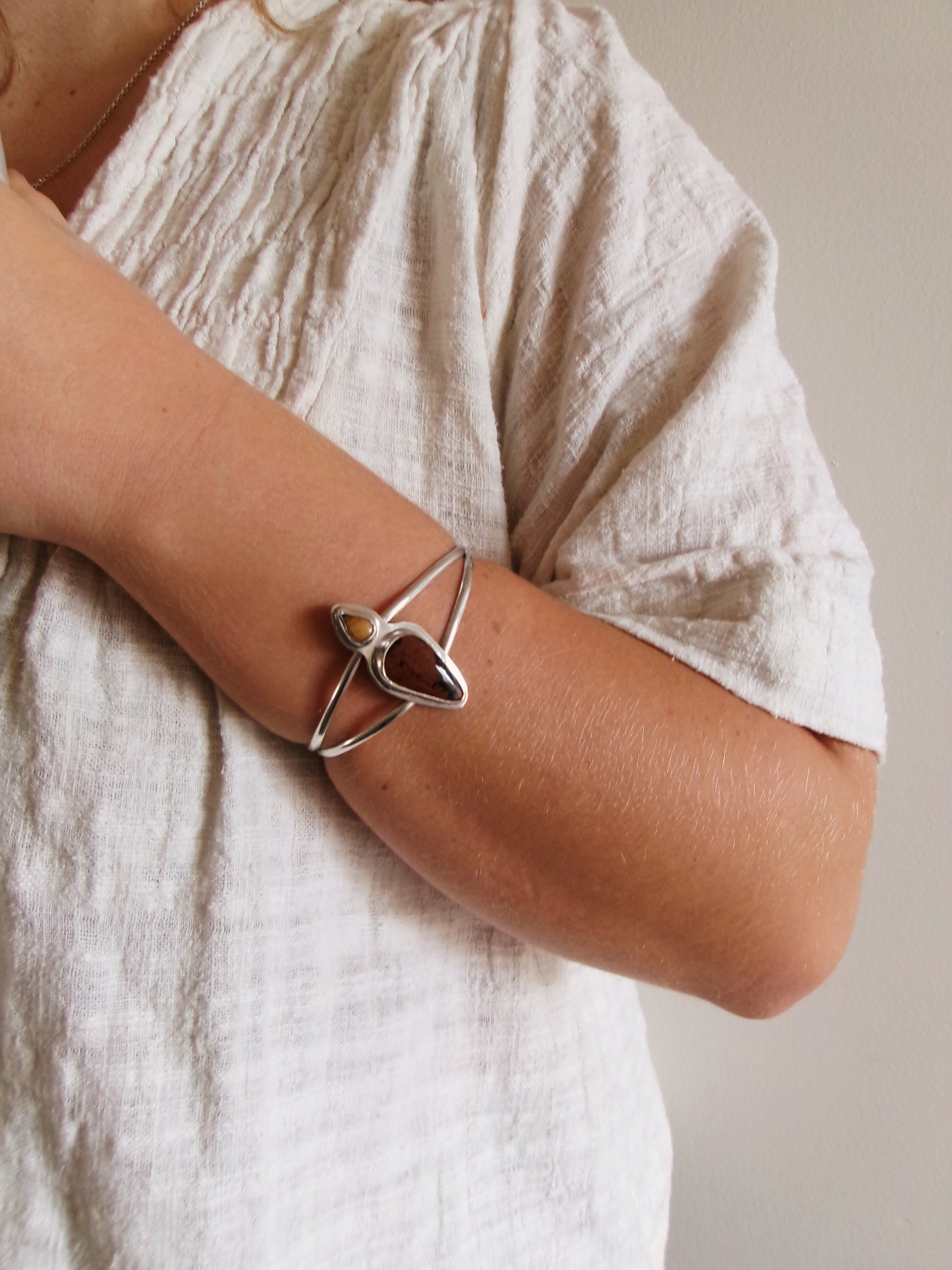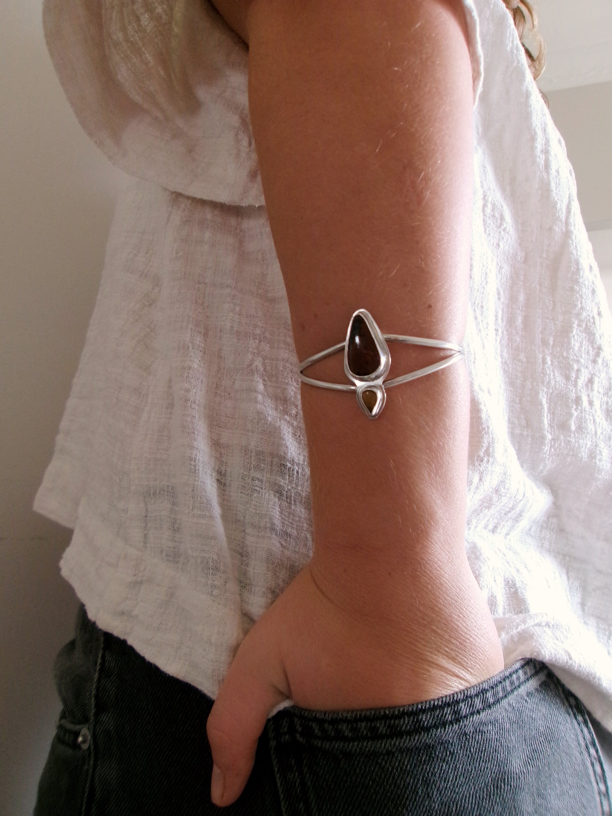 Mahogany Tears ~ A gorgeous bespoke adornment piece crafted by hand from sterling silver. Set with Mahogany Obsidian stone and below it, a tear drop tigers eye piece. Soldered to the setting a flattering double adjustable 16cm band.