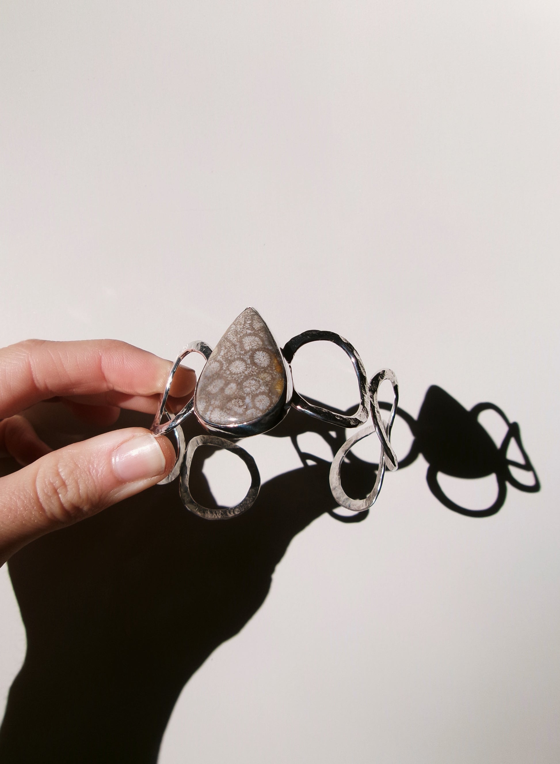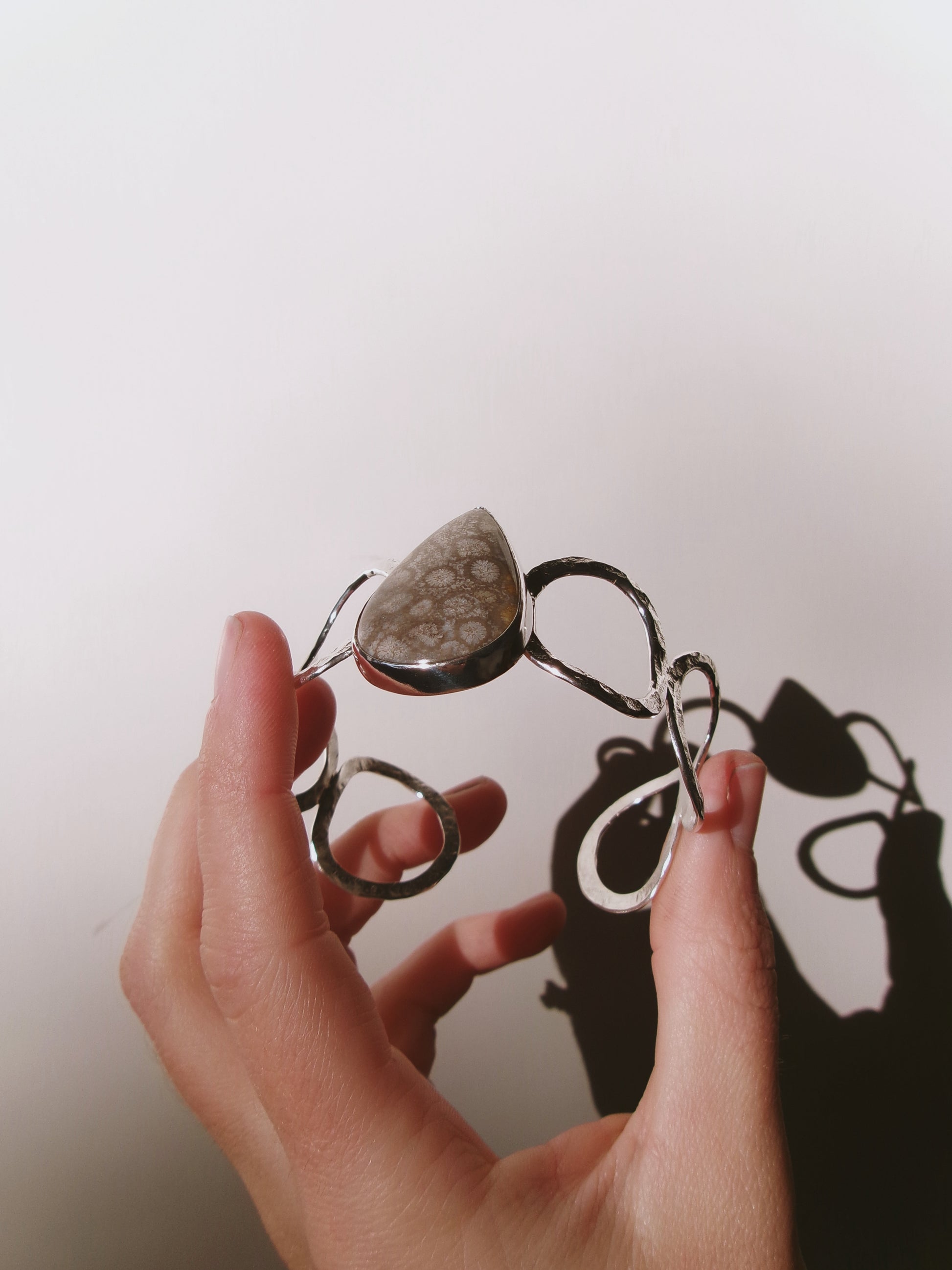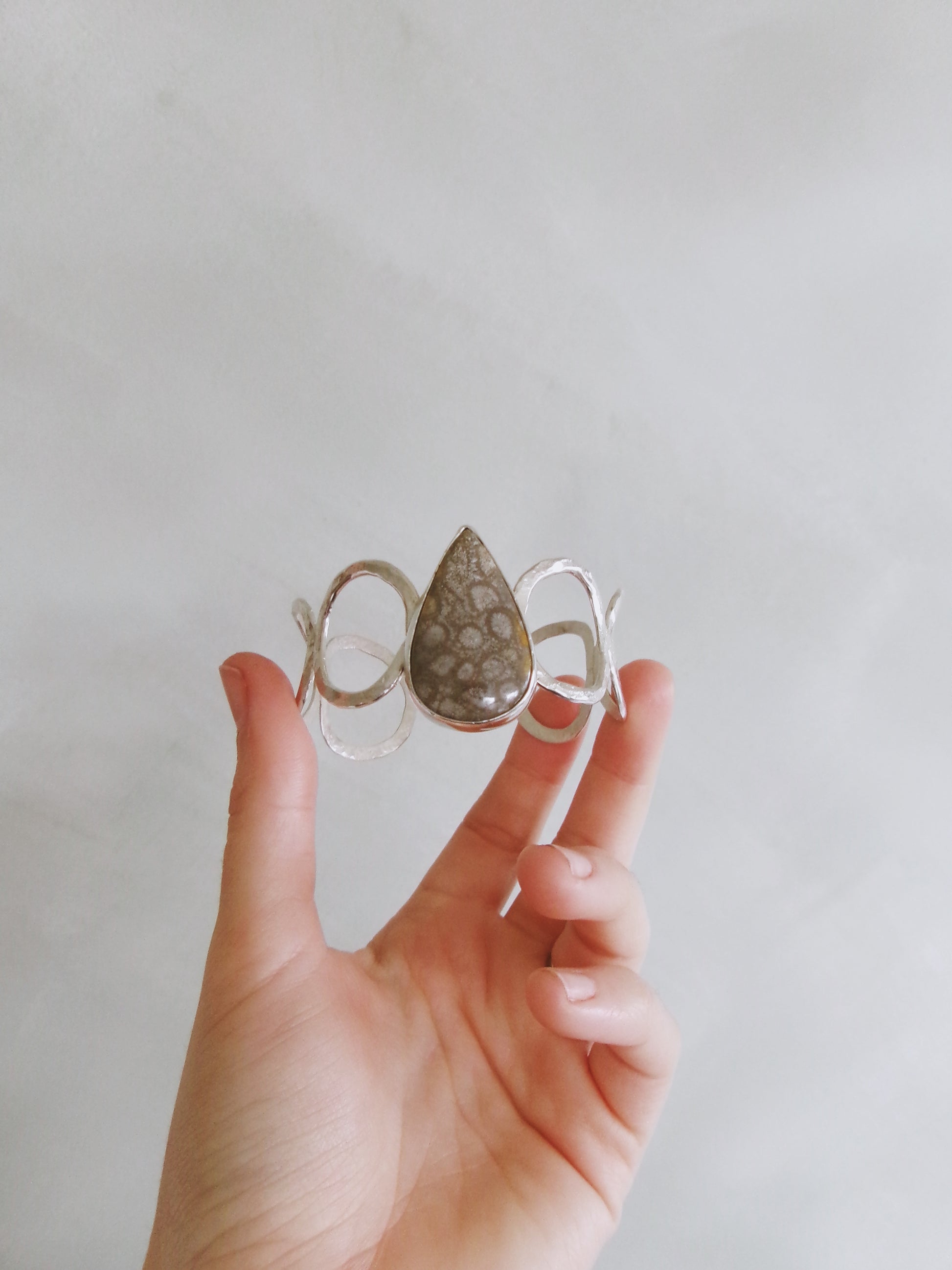 Sometimes you don’t know the value of a moment until it becomes a memory. Memories are moments gone, that can never be had again, but will live for ever in our minds. Forever frozen in time. The Fossilised Coral piece set at the heart of these bracelet/cuff bares that sentiment. They to are frozen in time. Engraved on the back of this piece a hidden message “Trust In Timing”. Set on adjustable 17cm band crafted by hand from sterling silver.