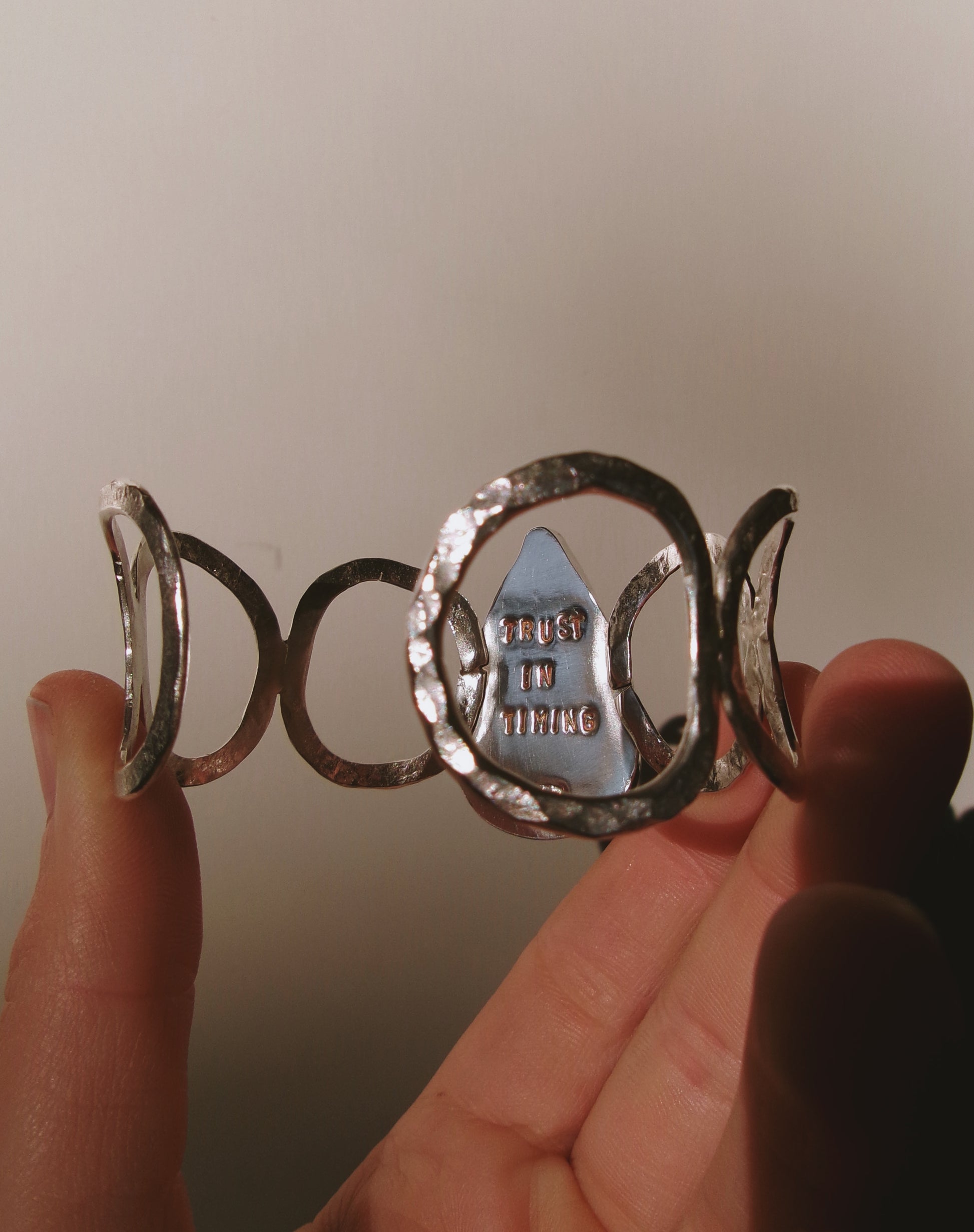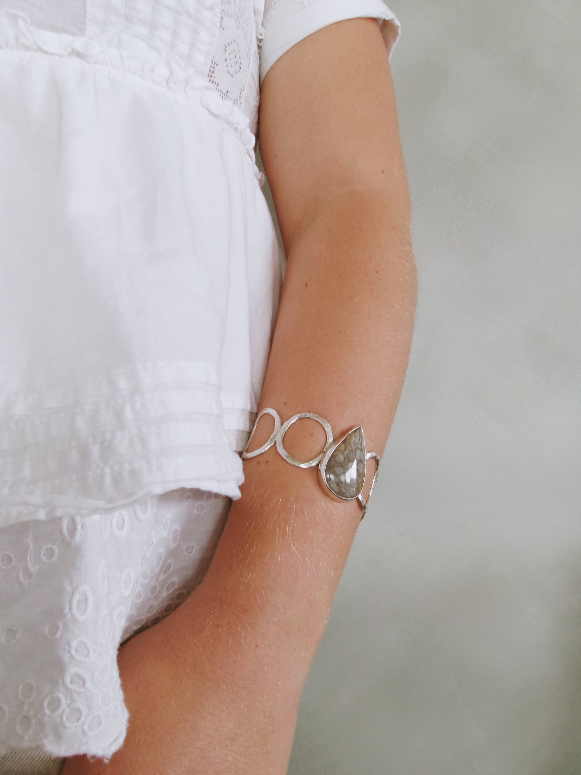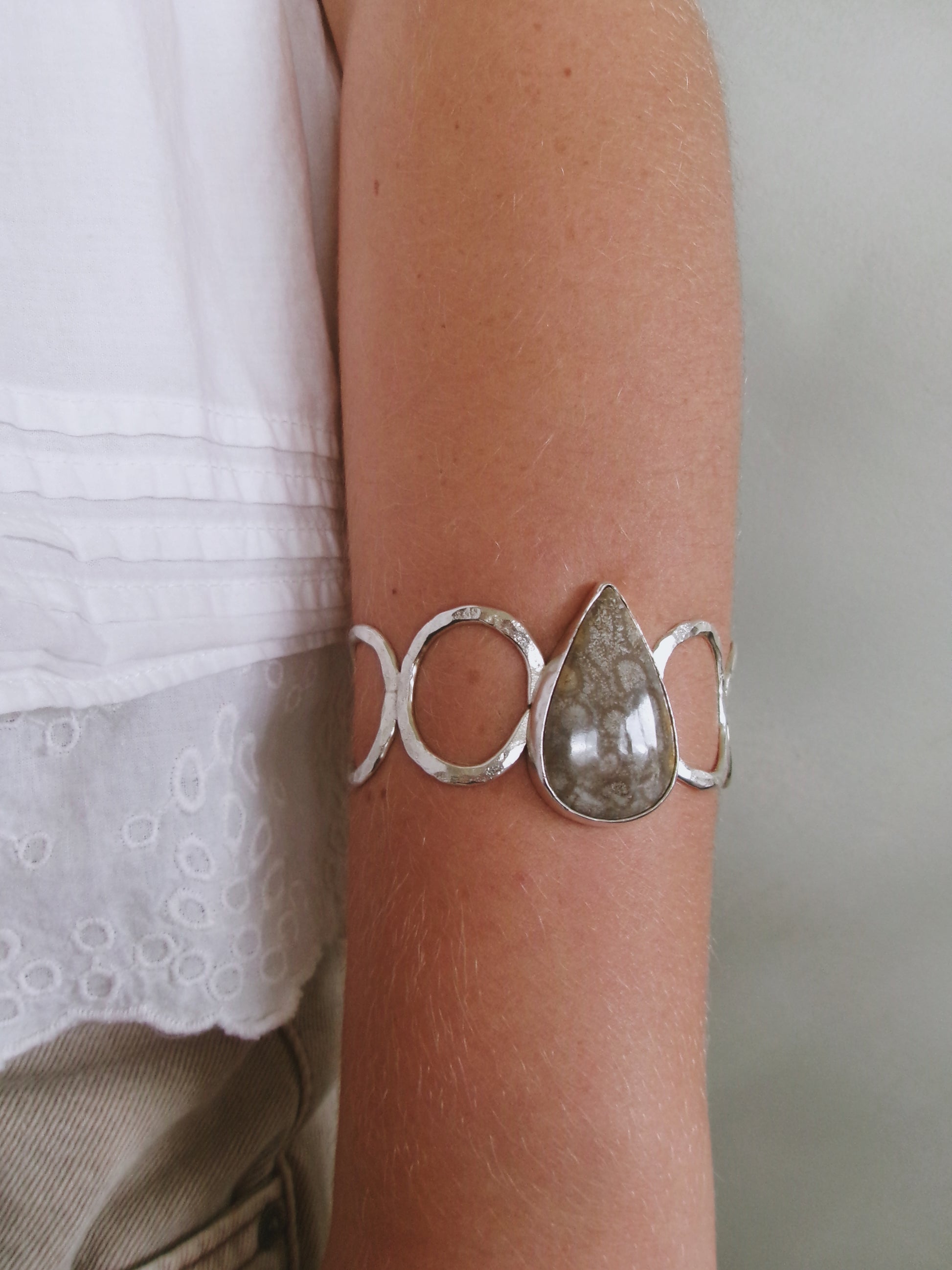Sometimes you don’t know the value of a moment until it becomes a memory. Memories are moments gone, that can never be had again, but will live for ever in our minds. Forever frozen in time. The Fossilised Coral piece set at the heart of these bracelet/cuff bares that sentiment. They to are frozen in time. Engraved on the back of this piece a hidden message “Trust In Timing”. Set on adjustable 17cm band crafted by hand from sterling silver.