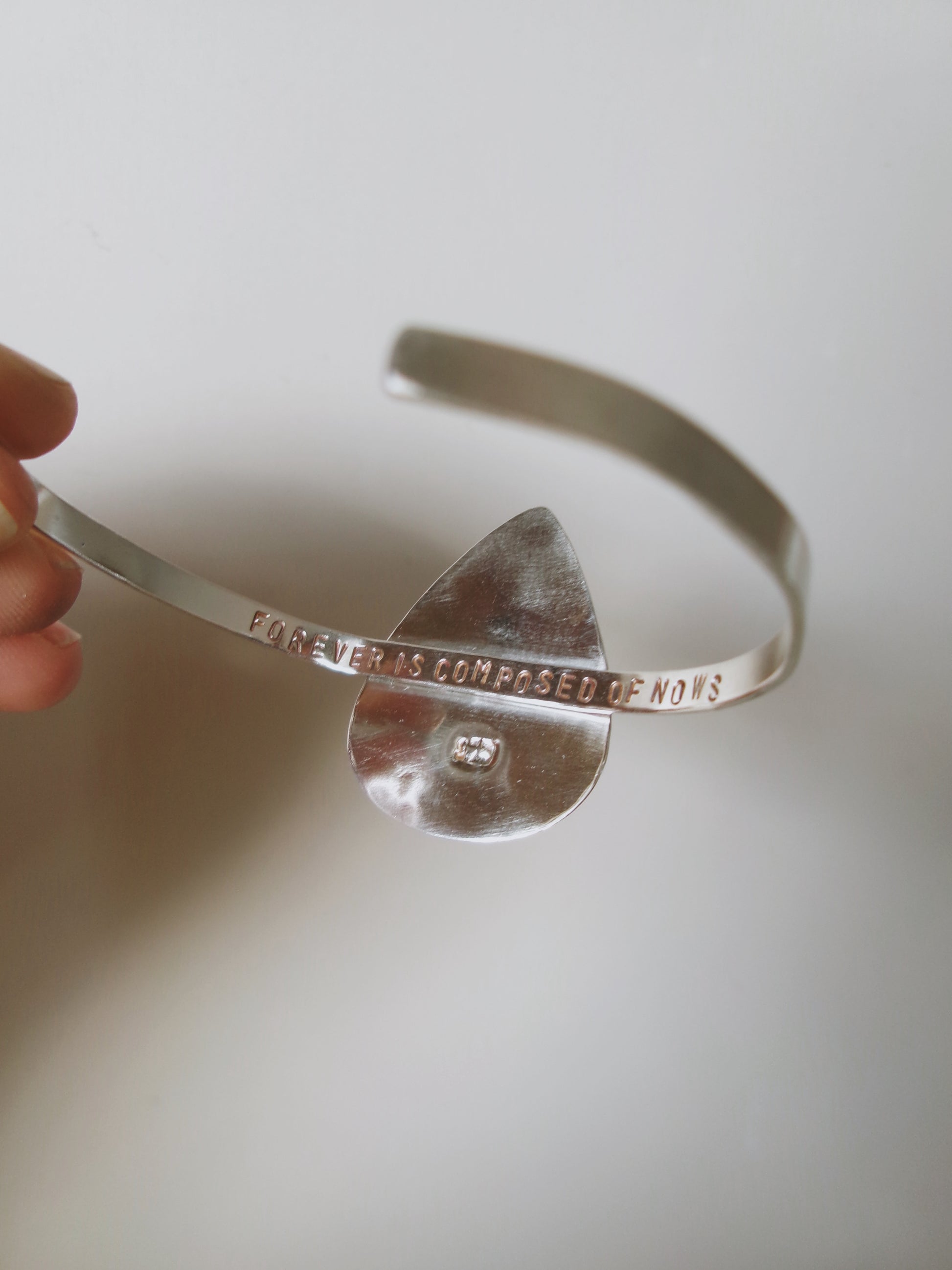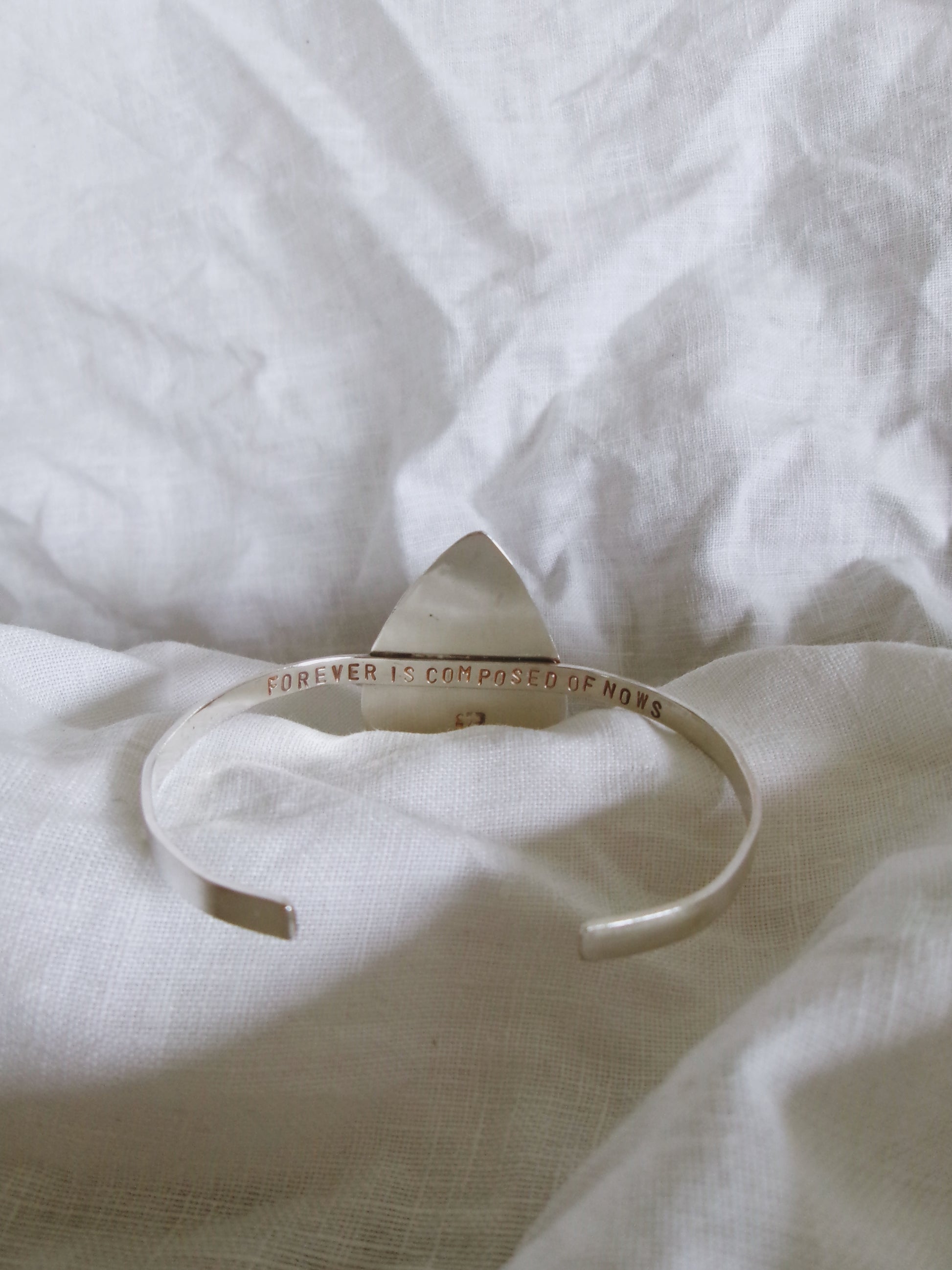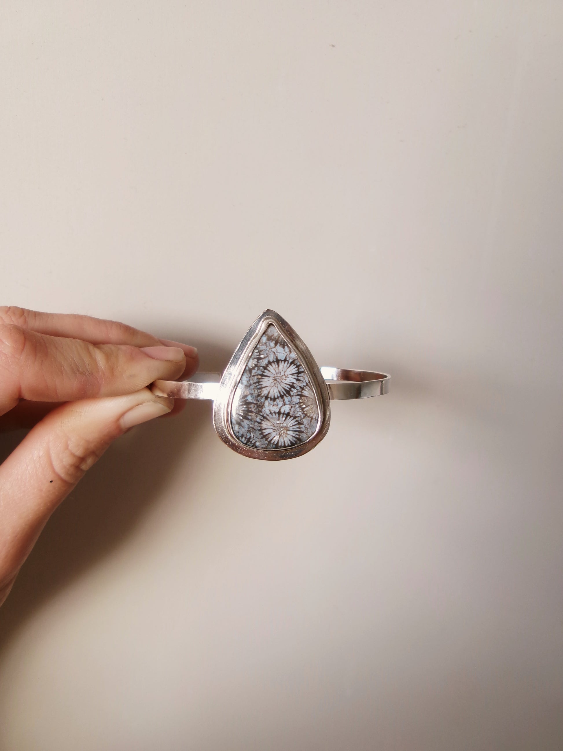 Sometimes you don’t know the value of a moment until it becomes a memory. Memories are moments gone, that can never be had again, but will live for ever in our minds. Forever frozen in time. The Fossilised Coral piece set at the heart of these bracelet/cuff bares that sentiment. They to are frozen in time. Engraved on the inside of the band a hidden message “Forever is composed of now’s”. Set on adjustable 16cm band crafted by hand from sterling silver. Size 6
