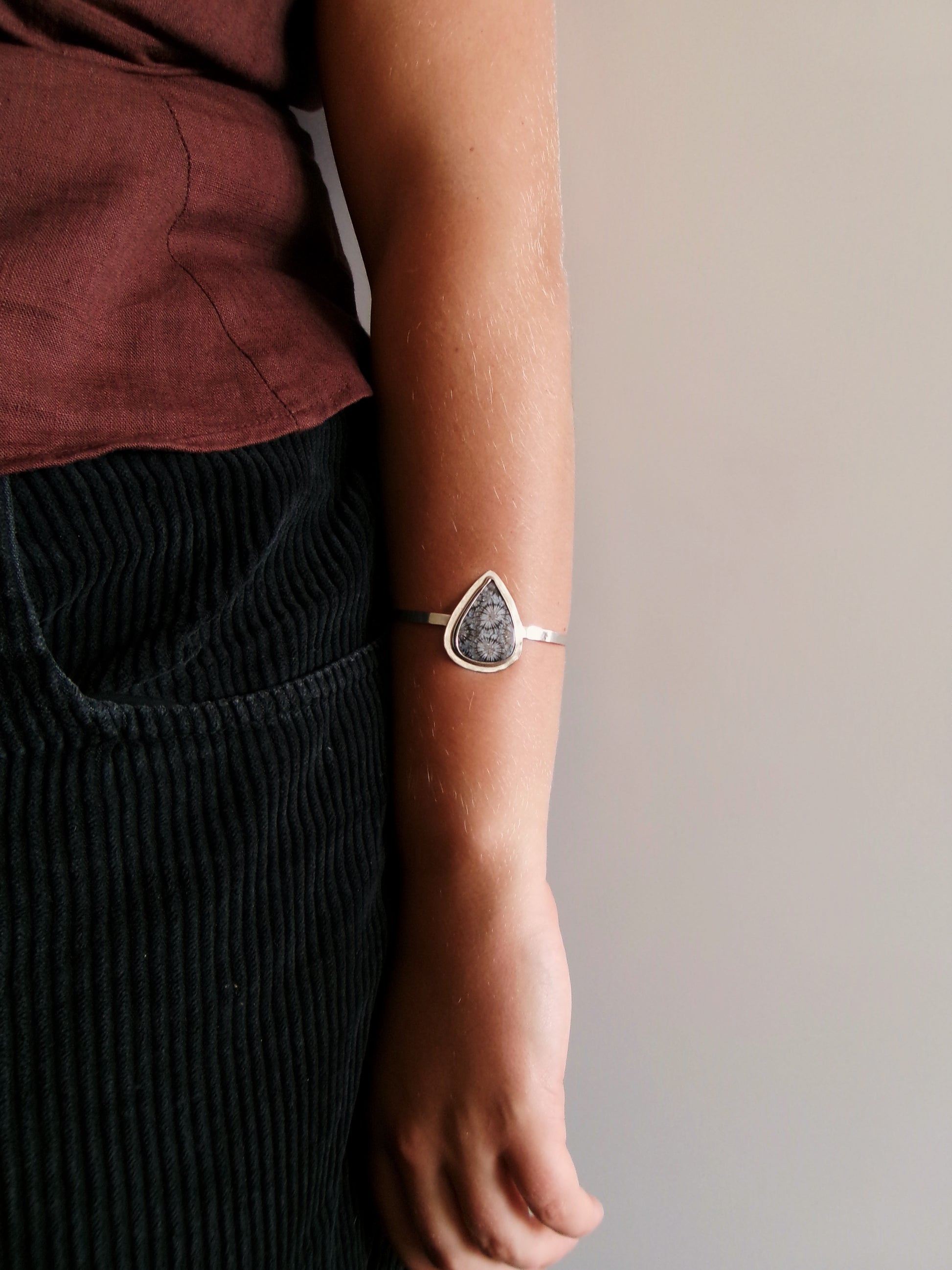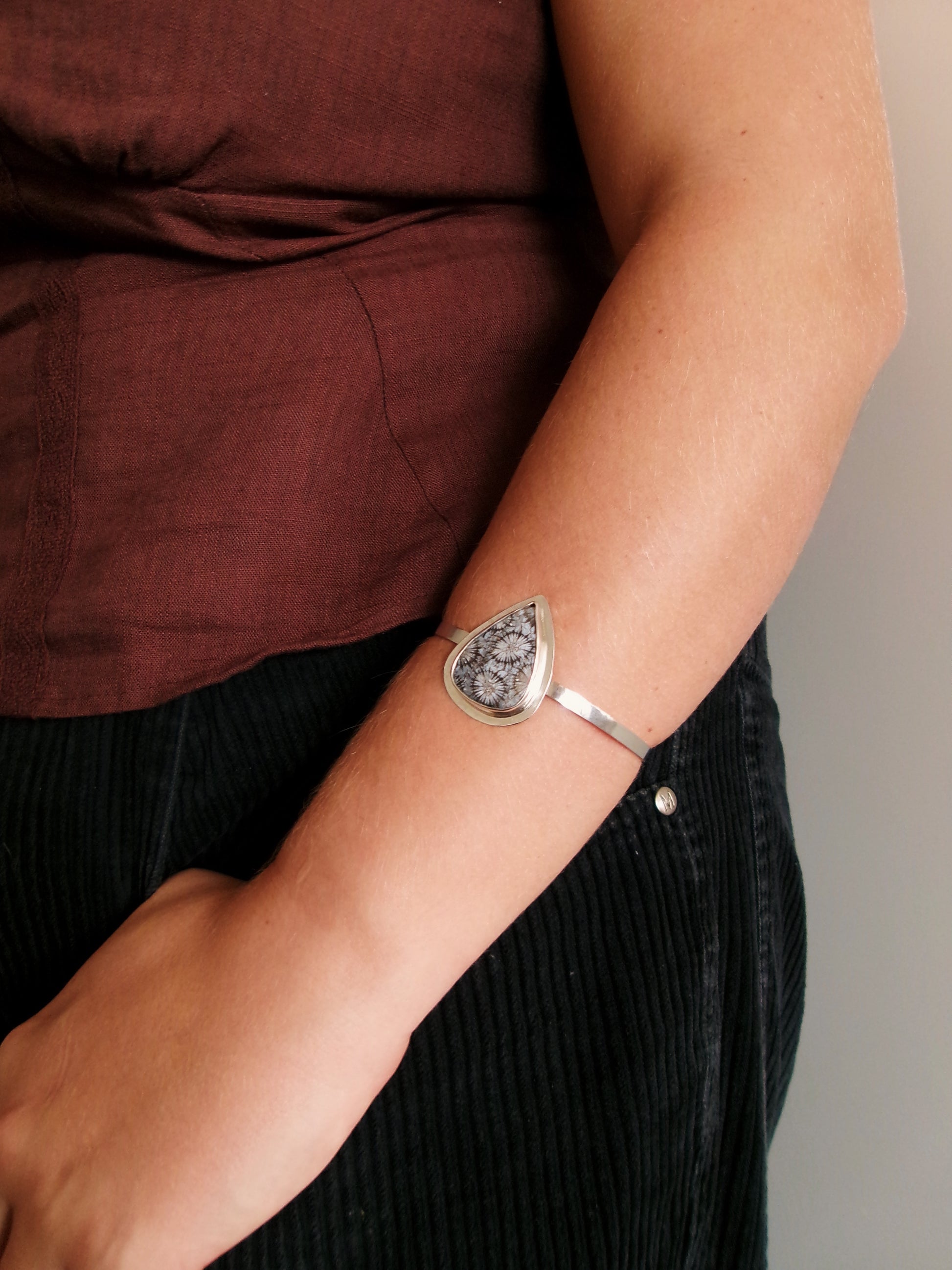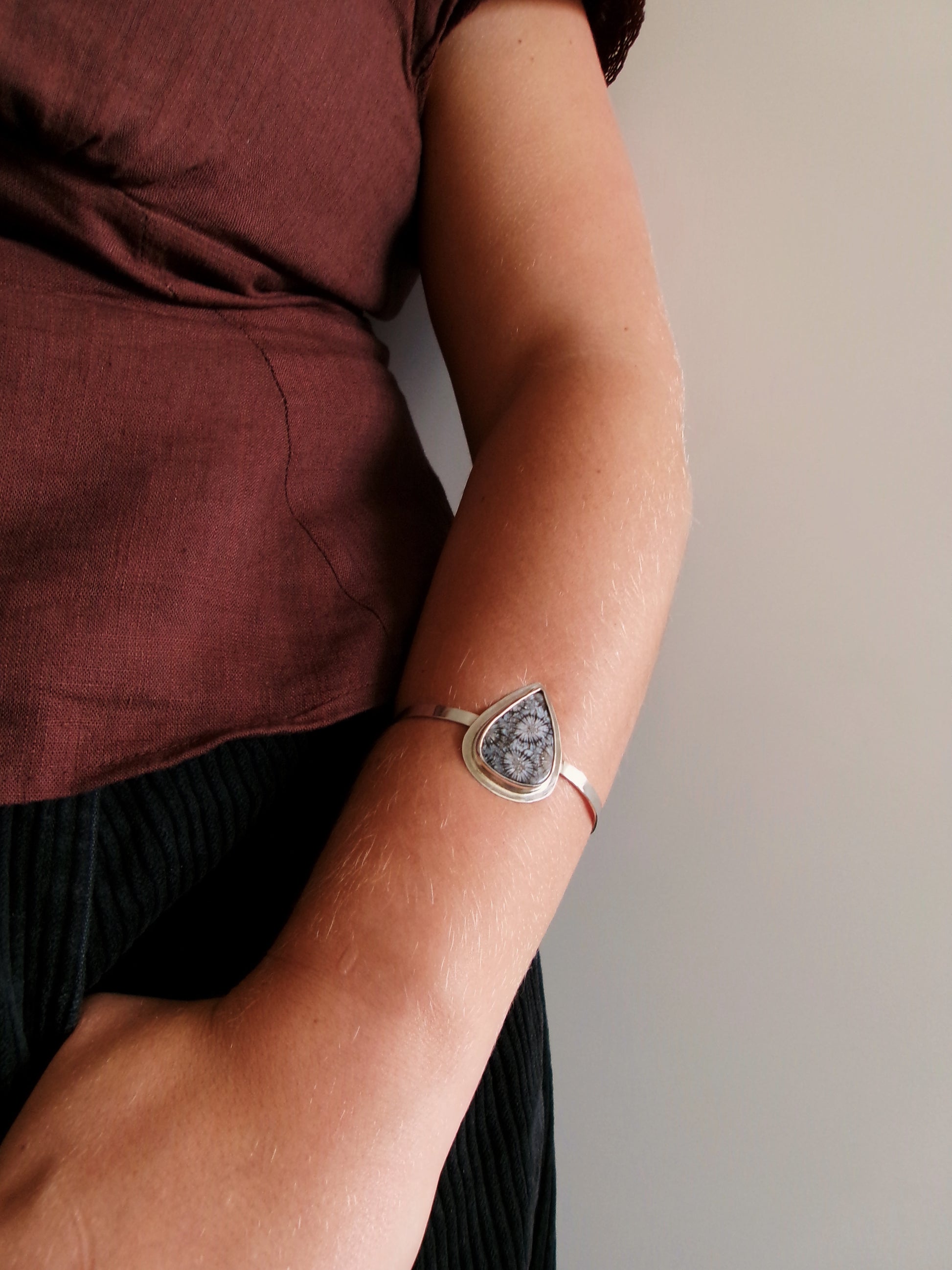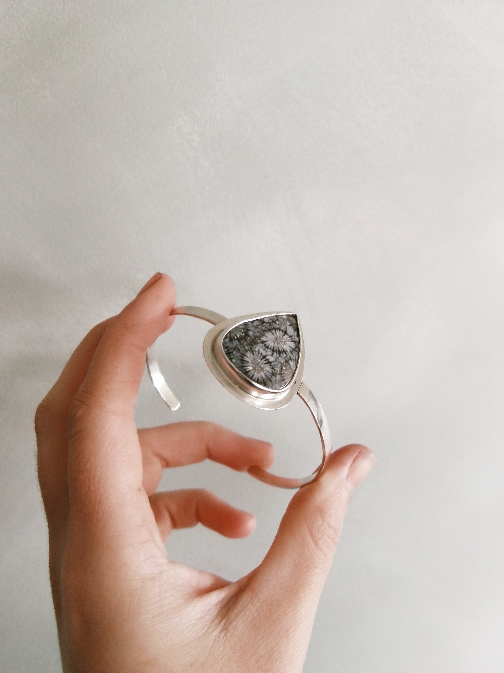 Sometimes you don’t know the value of a moment until it becomes a memory. Memories are moments gone, that can never be had again, but will live for ever in our minds. Forever frozen in time. The Fossilised Coral piece set at the heart of these bracelet/cuff bares that sentiment. They to are frozen in time. Engraved on the inside of the band a hidden message “Forever is composed of now’s”. Set on adjustable 16cm band crafted by hand from sterling silver. Size 6