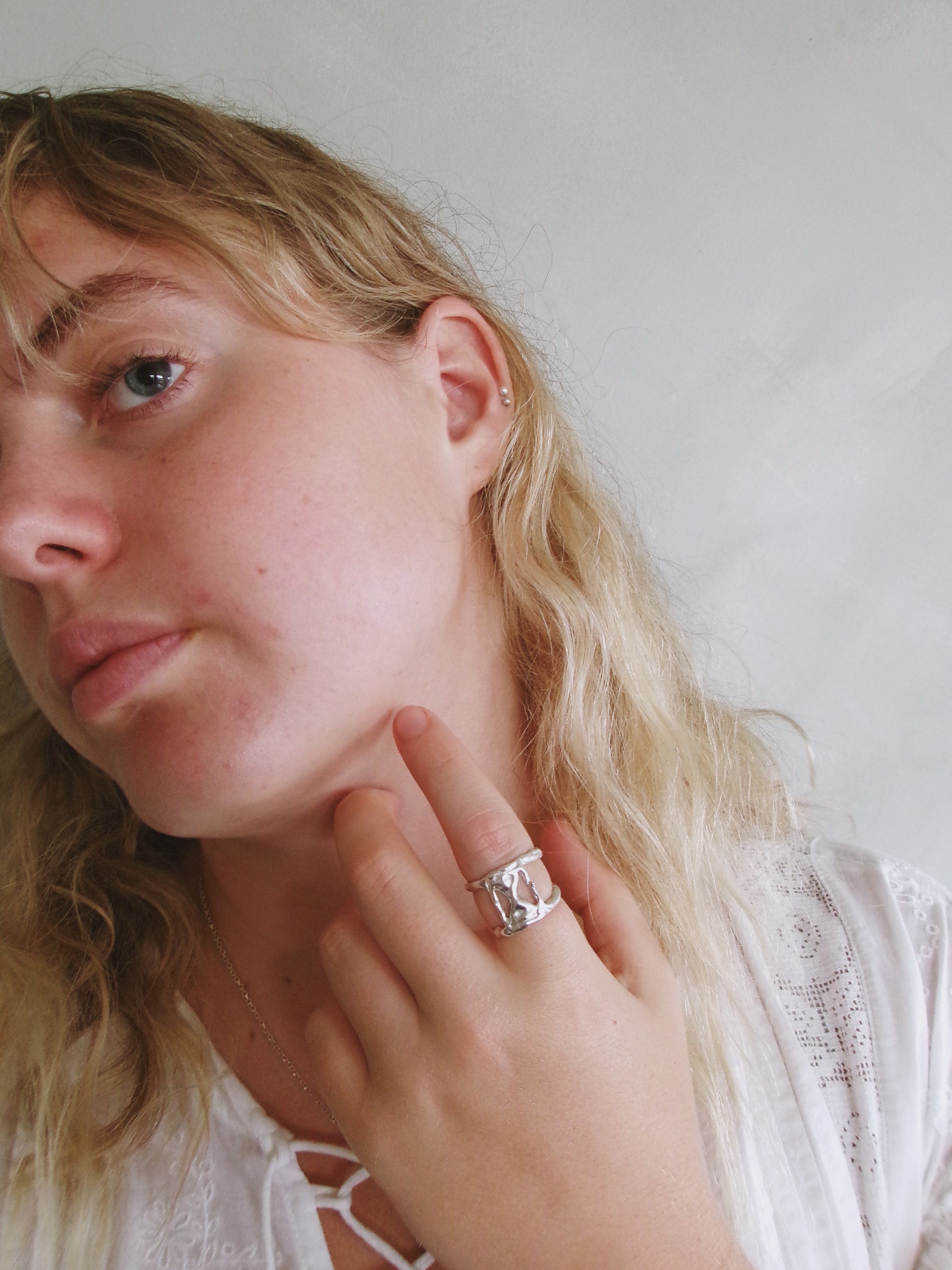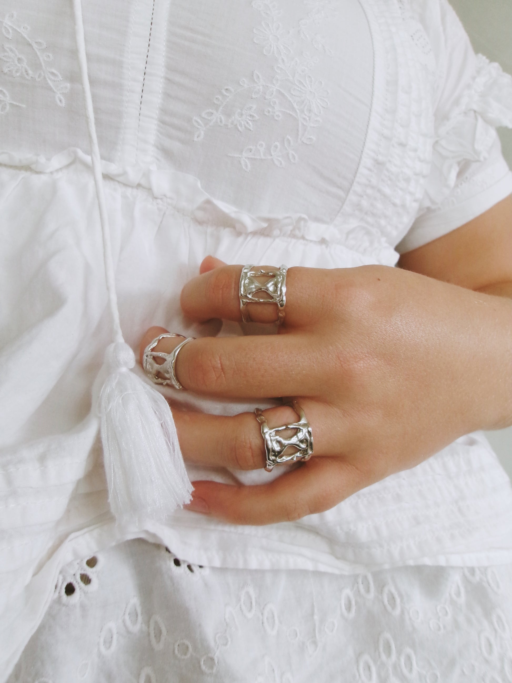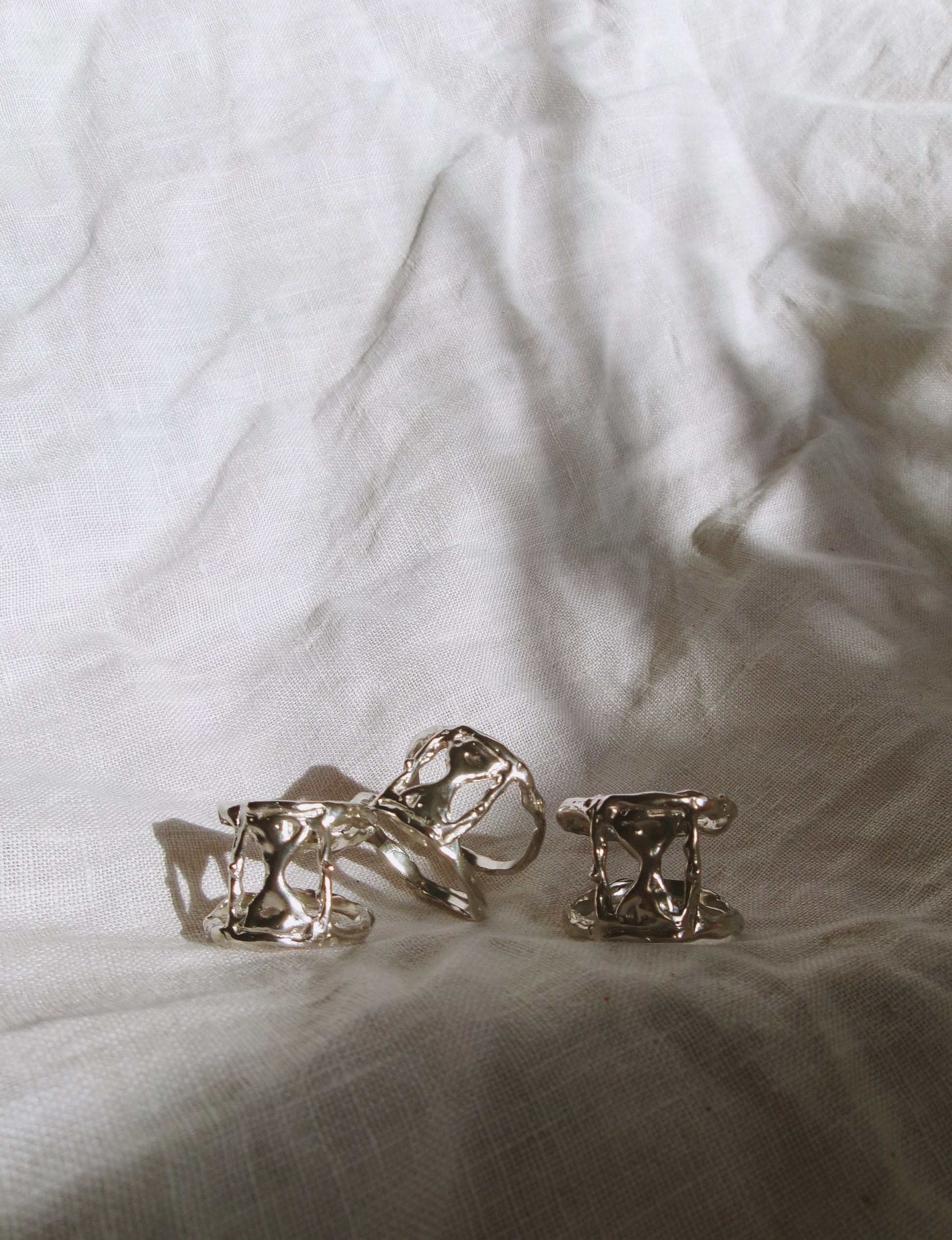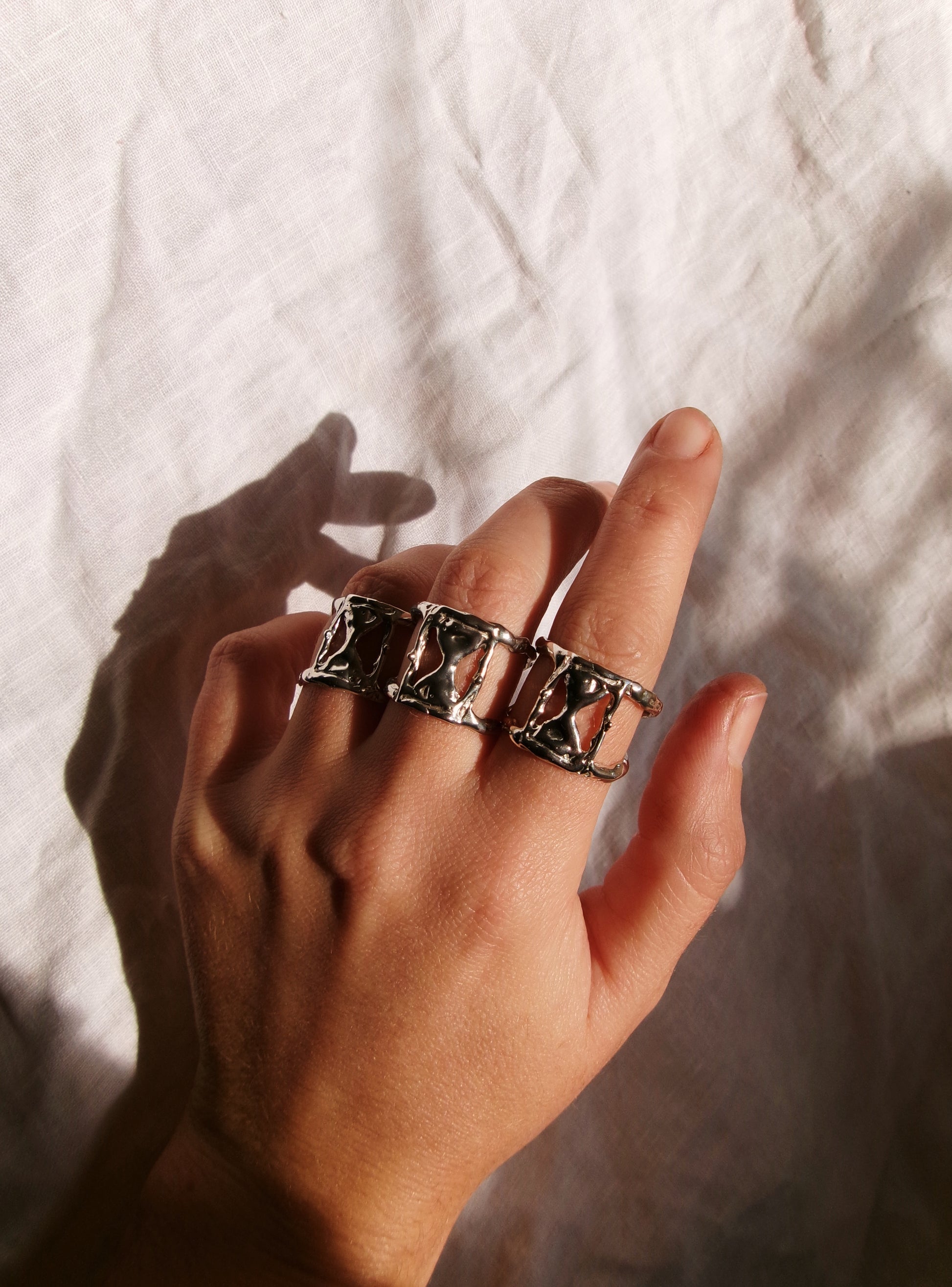 A delicate fusion of art and time, the “MOMENT” ring captures the ephemeral beauty of the now. Sculpted in wax, formed from molten silver, the abstract, organic style, hourglass form symbolizes the fluid passage of time—never still, always shifting. Worn on the hand, it becomes a quiet reminder: life is not measured in hours, but in heartbeats, glances, and whispers. Fleeting and precious. This ring invites you to pause, feel, and simply be in the moment. size 7.5 (p)