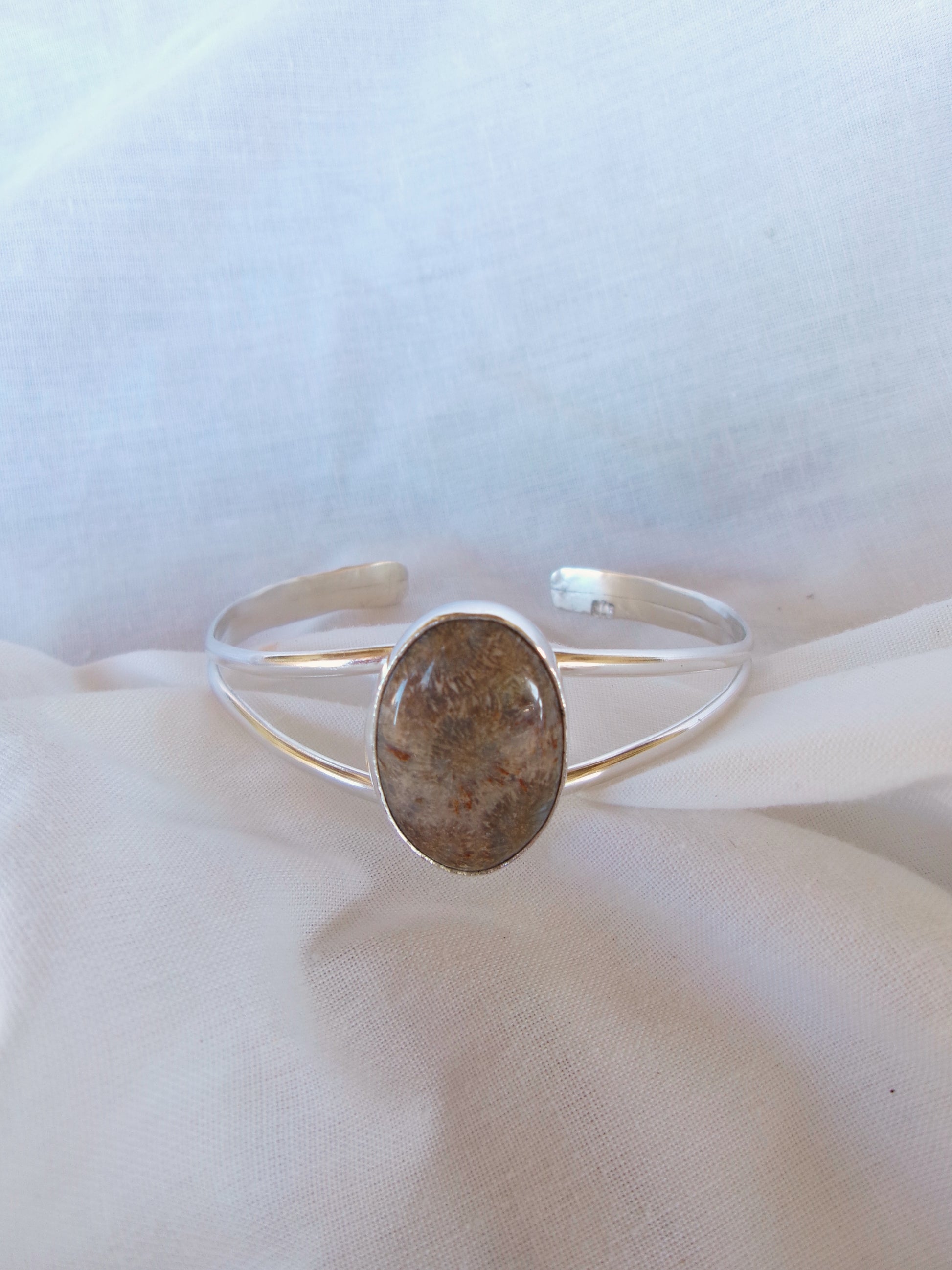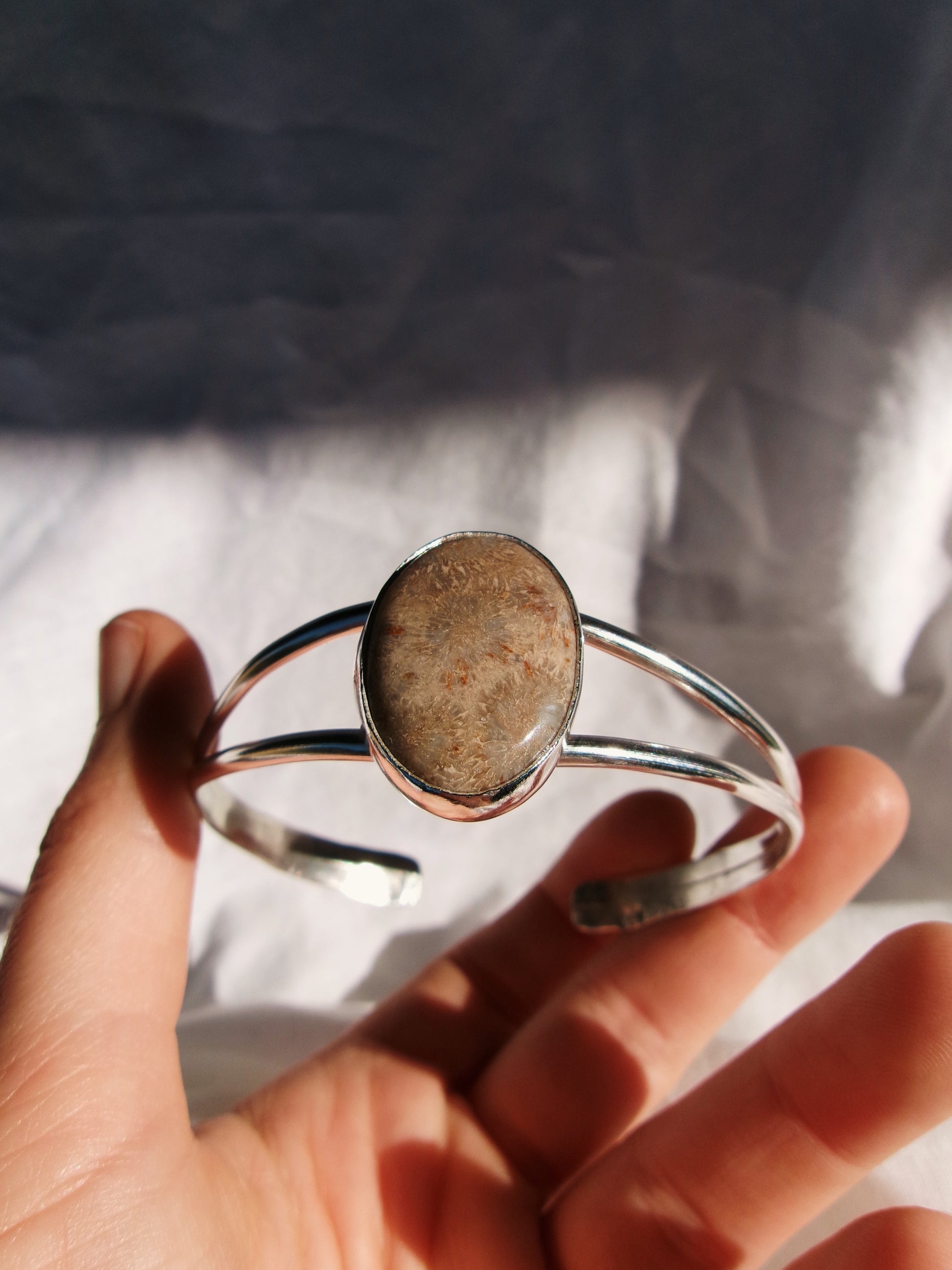 This simple cuff is effortless staple for every day wear. Set in its arms is a breathtaking piece of fossilised coral. Forever captured in its sterling silver setting. Completely hand crafted from 925 sterling silver. 17cm adjustable band can be worn lower or higher on the forearm depending on preference.