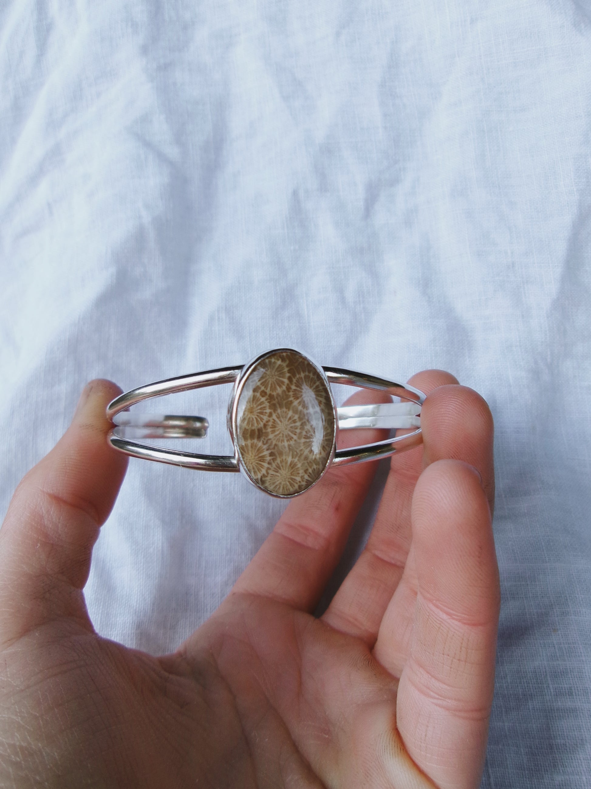 Set at the heart of this handmade cuff is a mesmerising fossilized coral piece with intricate floral patterns formed over millennia, each piece is a quiet testament to the beauty of transformation and the artistry of the Earth. A wearable fragment of ancient seabeds, where flowers once thrived in ocean gardens beneath the waves and slowly turned to stone. A truly bespoke creation. Set on a 16cm adjustable band