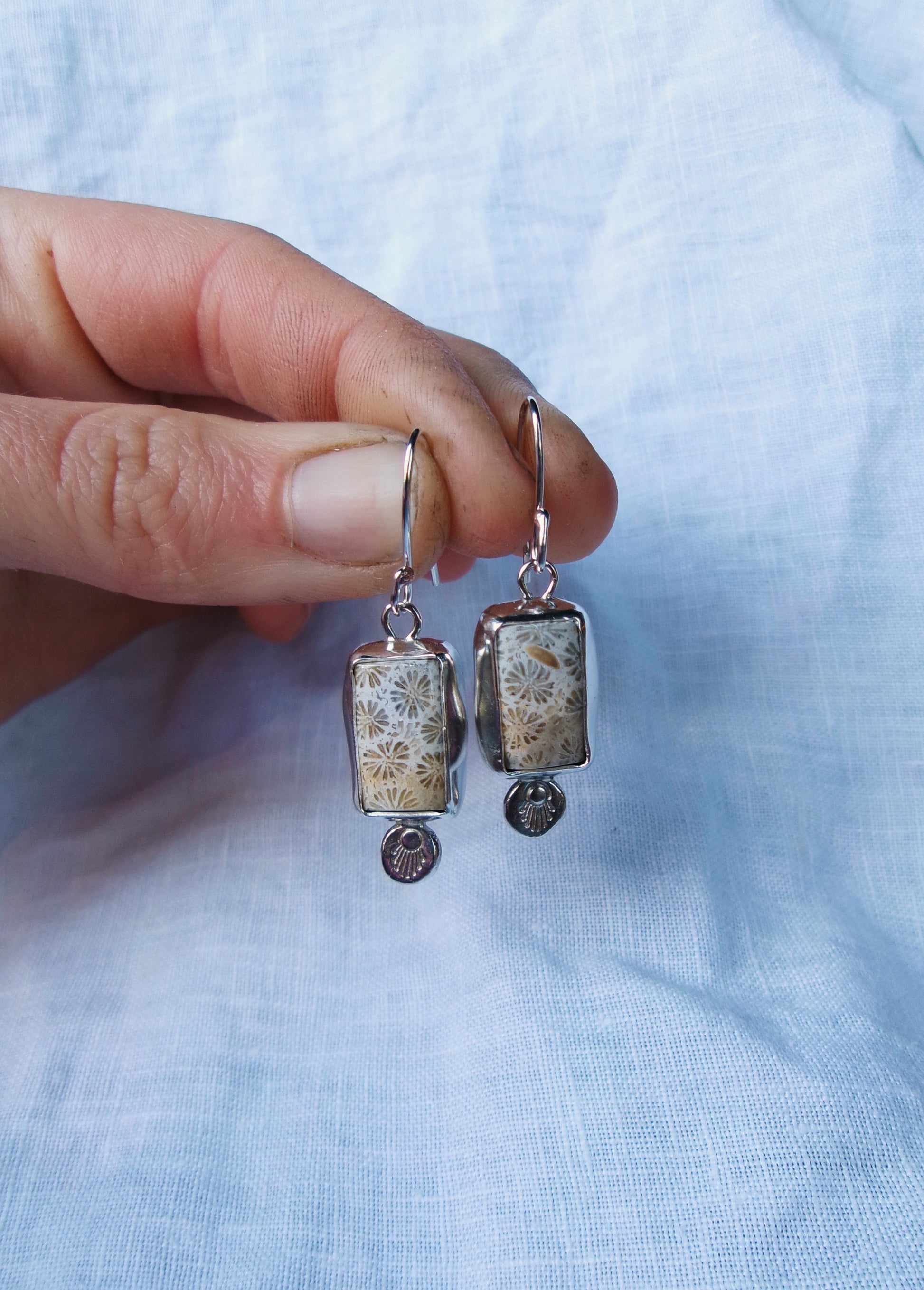 Set at the heart of these handmade earrings are mesmerising fossilized coral pieces with intricate floral patterns formed over millennia, each piece is a quiet testament to the beauty of transformation and the artistry of the Earth. A wearable fragment of ancient seabeds, where flowers once thrived in ocean gardens beneath the waves and slowly turned to stone. Decorated by the little hand stamped charm soldered below. A truly bespoke creation.