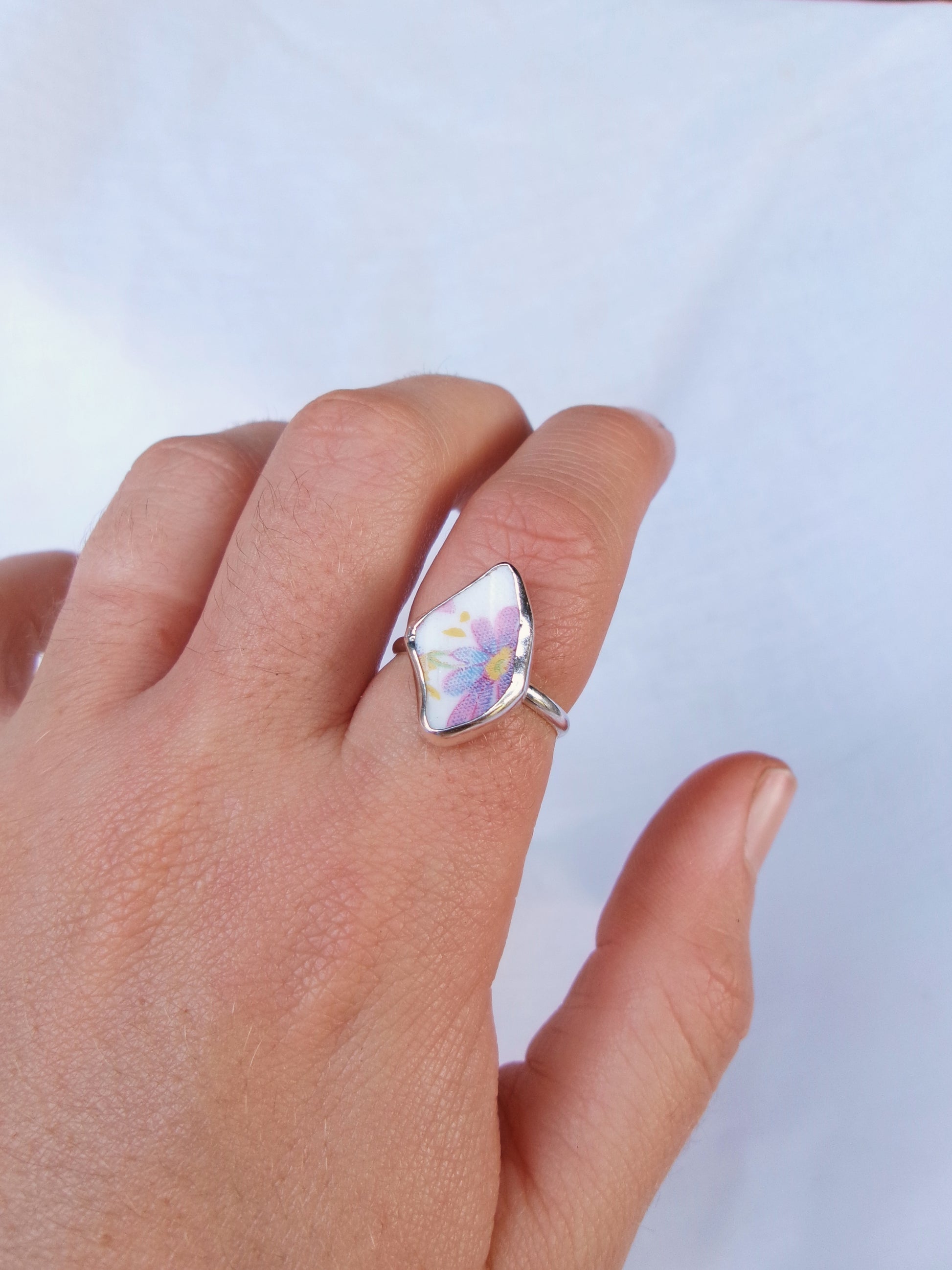 This ring is hand crafted from a teacup fragment , repurposed into wearable art. A forever adornment piece. Size 7 (O)