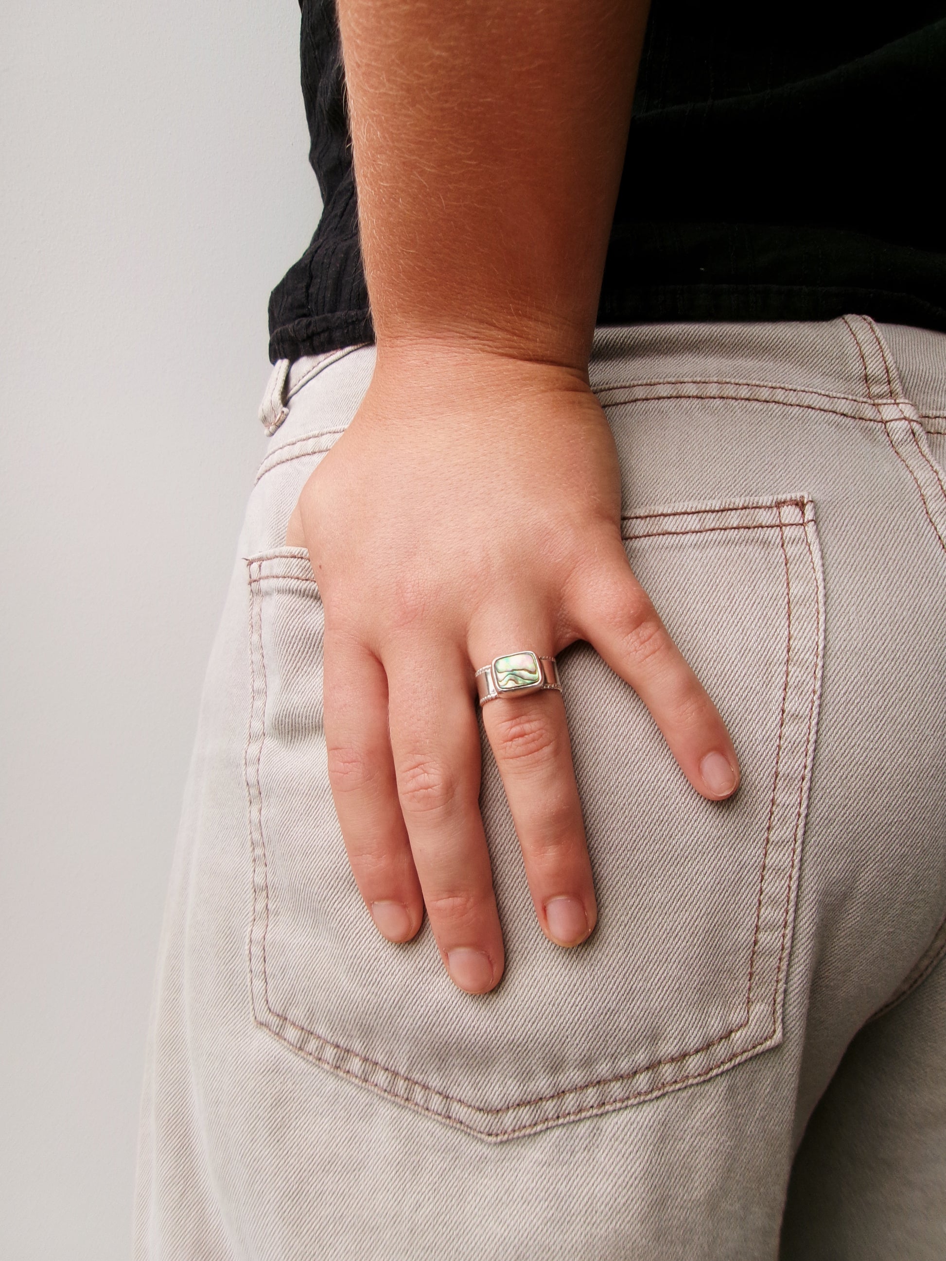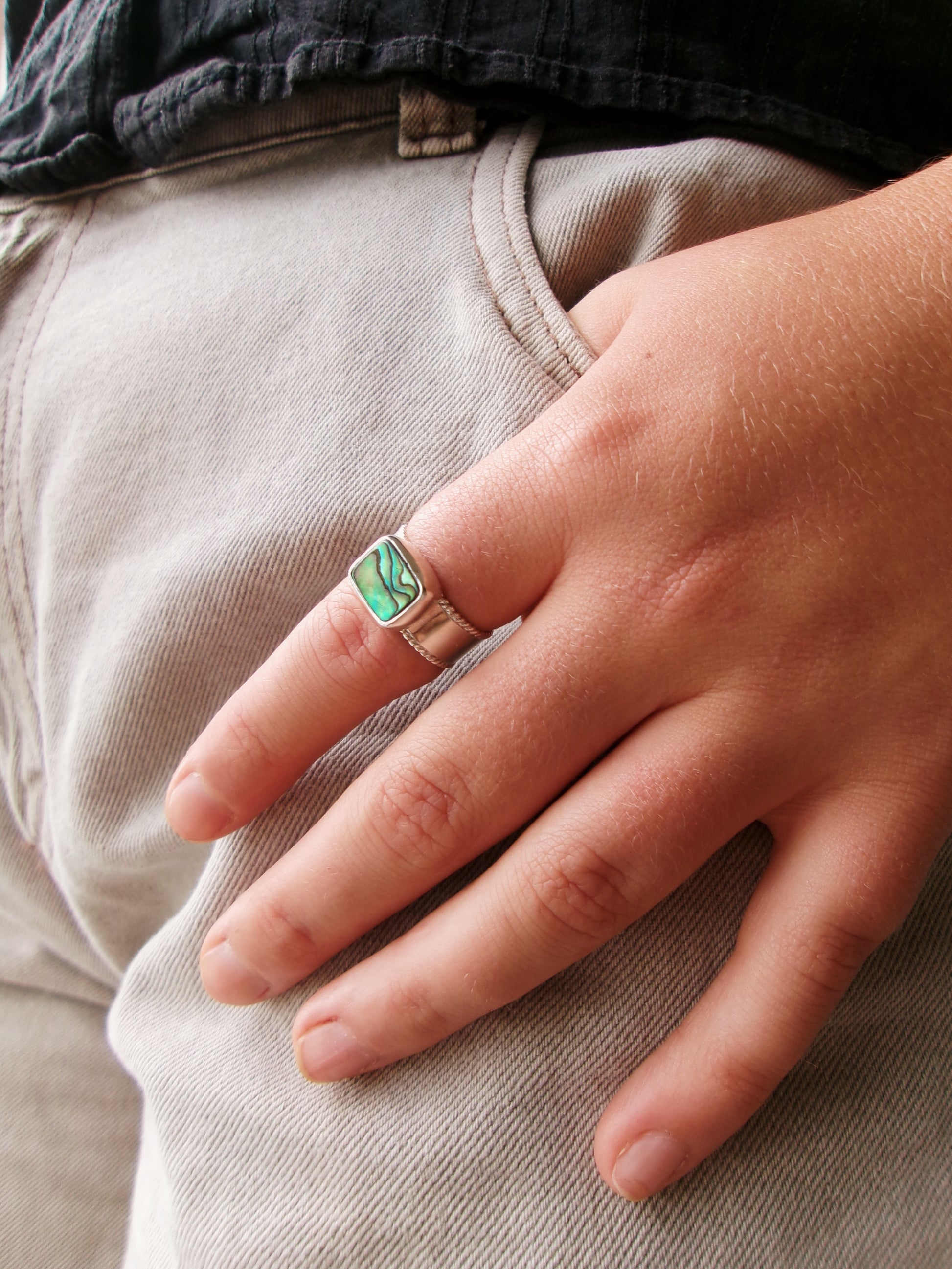Handcrafted in sterling silver and set with abalone shell, these rings reflect the iridescent hues of the sea’s secret tidal pools. Each shell a miniature ocean landscape, shaped by nature and silversmiths hands alike. Set on a decorative band lined with the twisted wire carefully soldered to it, Size 8 (Q)
